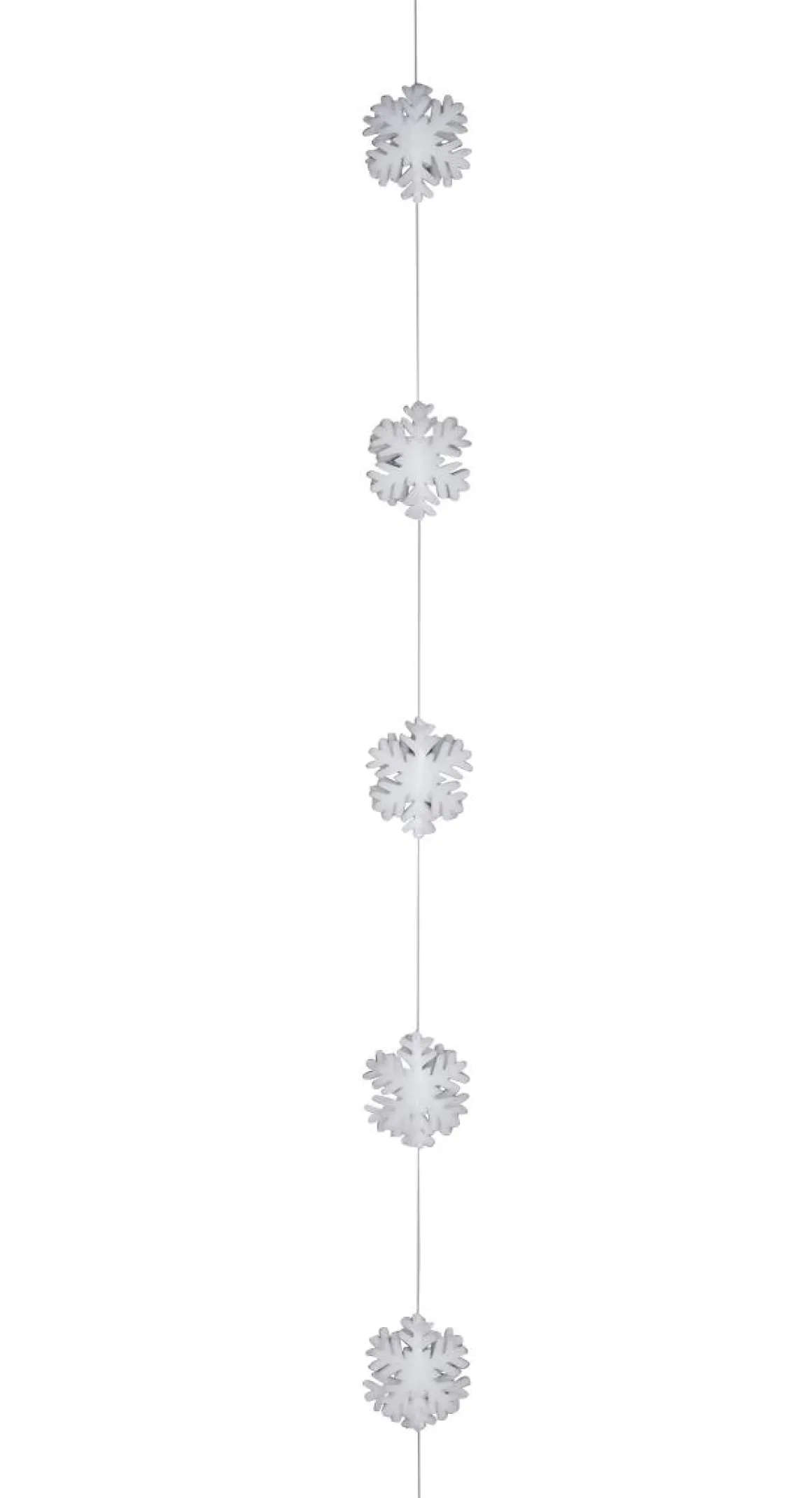 Schön verarbeitete 3D Schneeflocken-Girlande, flach, aus weißem Filz, 2 cm dick, 180 cm lang und mit 7 Schneeflocken à jeweils 17 cm.
