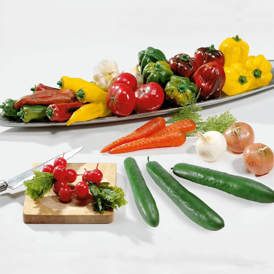 Mit Deluxe Gemüse Attrappen von Deko Woerner erhalten Sie die perfekte Imitation von frischem Gemüse. Für ansprechende, appetitanregende Dekorationen zum Thema Essen und Ernährung. Das Deko Gemüse ist perfekt geeignet als Ersatz für verderbliche Nahrungsmittel und ein toller Blickfang auf dem Buffet, in Auslagen oder im Schaufenster. Hochwertig verarbeitet ist dieses künstliche Gemüse aus lackiertem Hartschaum sehr lebensecht und wunderbar anzuschauen. Sogar das Gewicht ist, anders als bei Kunststoff-Attrappen, angepasst und nahezu real. Preis per Pack à 3 Stück.