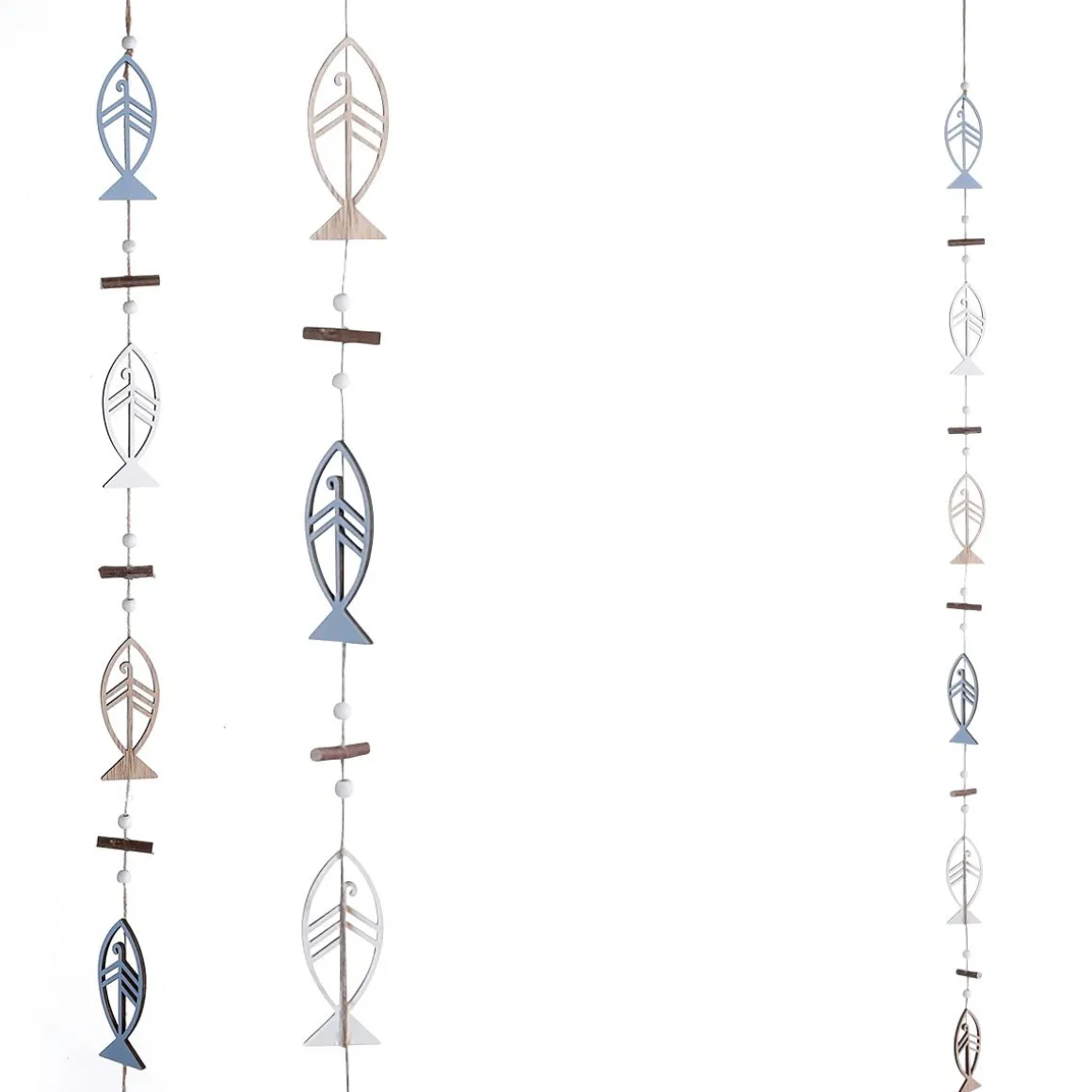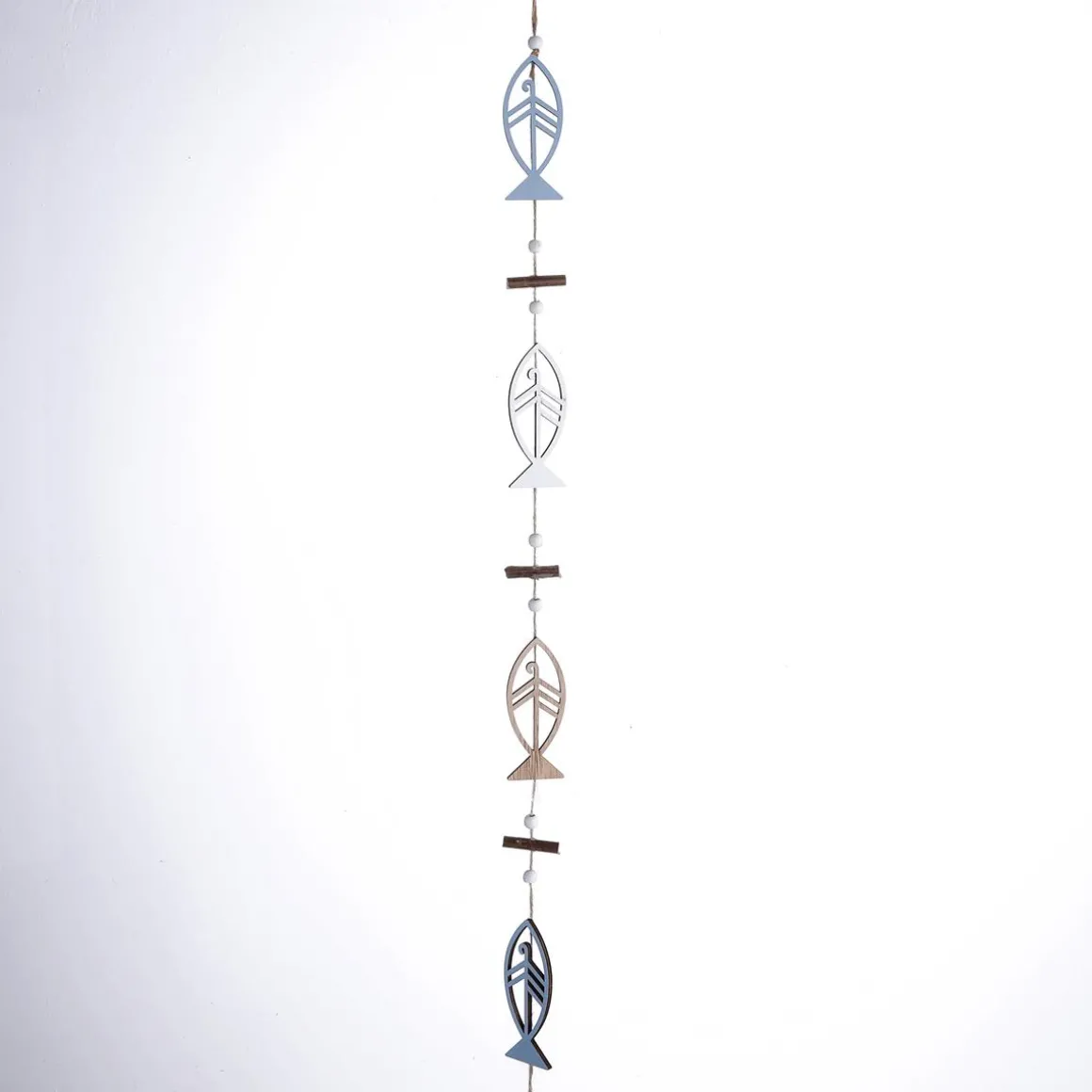 Schön verarbeitete rustikale Fisch-Silhouetten-Girlande mit weißen, blauen und braunen aus Holz gefrästen Fisch-Silhouetten, an einem Hanfseil fixiert. Zwischen den Deko-Fischen sind Holz-Stäbchen und Perlen angebracht. Mit der rustikalen Fisch-Deko-Kette, können Sie wunderschönen Maritimen Dekorationen zaubern. Ob in Ihr Zuhause, Schaufenster, Hotel oder auf Events, die Maritime-Deko-Kette macht immer eine tolle Figur.