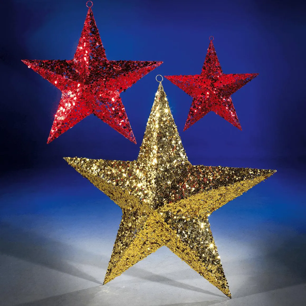 In beeindruckender Größe präsentiert sich dieser Paillettenstern aus Metall. Die dreidimensionale Oberfläche lässt die Kunststoff-Pailletten funkeln, so erstrahlt der Deko Stern in tollem Glanz. Der Stern ist halbplastisch und kann flach an die Wand gehängt werden. Mit Aufhängeöse. Preis per Stück.