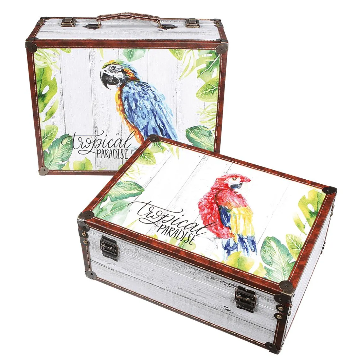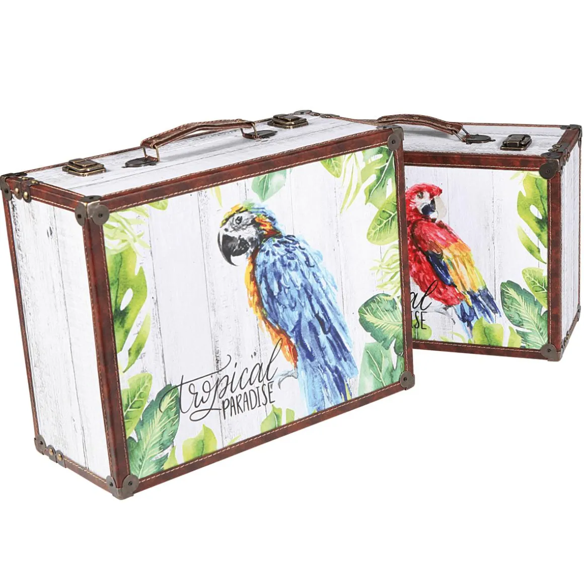 Dieses zweiteilige rechteckige Deko-Kofferset mit dekorativem Papagei-Aufdruck ist nicht nur ein wundervoller Blickfang in Ihrer Sommerdekoration sondern eignet sich auch zur Aufbewahrung von kleinen Accessoires. Die Koffer sind unterschiedlich groß: 16 x 38 cm und 19 x 43 cm. Hochwertige Verarbeitung aus MDF, Bezug aus PE, Schnappschlösser aus Metall und Tragegriff. Für die Aufbewahrung können die Koffer platzsparend ineinander gestellt werden. Preis per Set.
