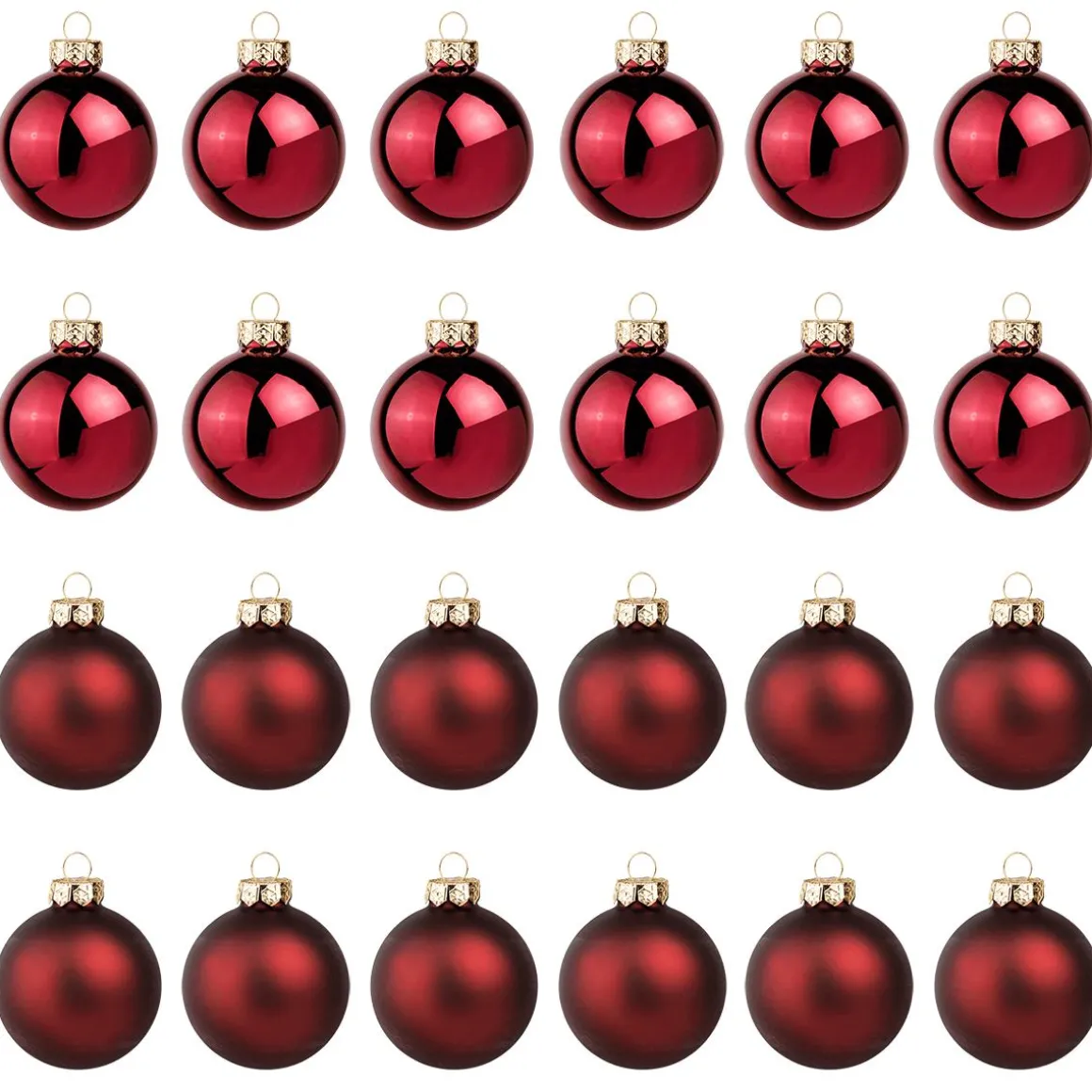 Bordeauxrote Christbaumkugeln aus Glas in matt und glänzend sortiert