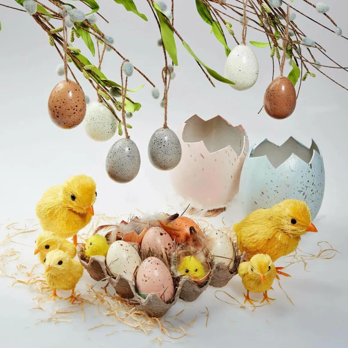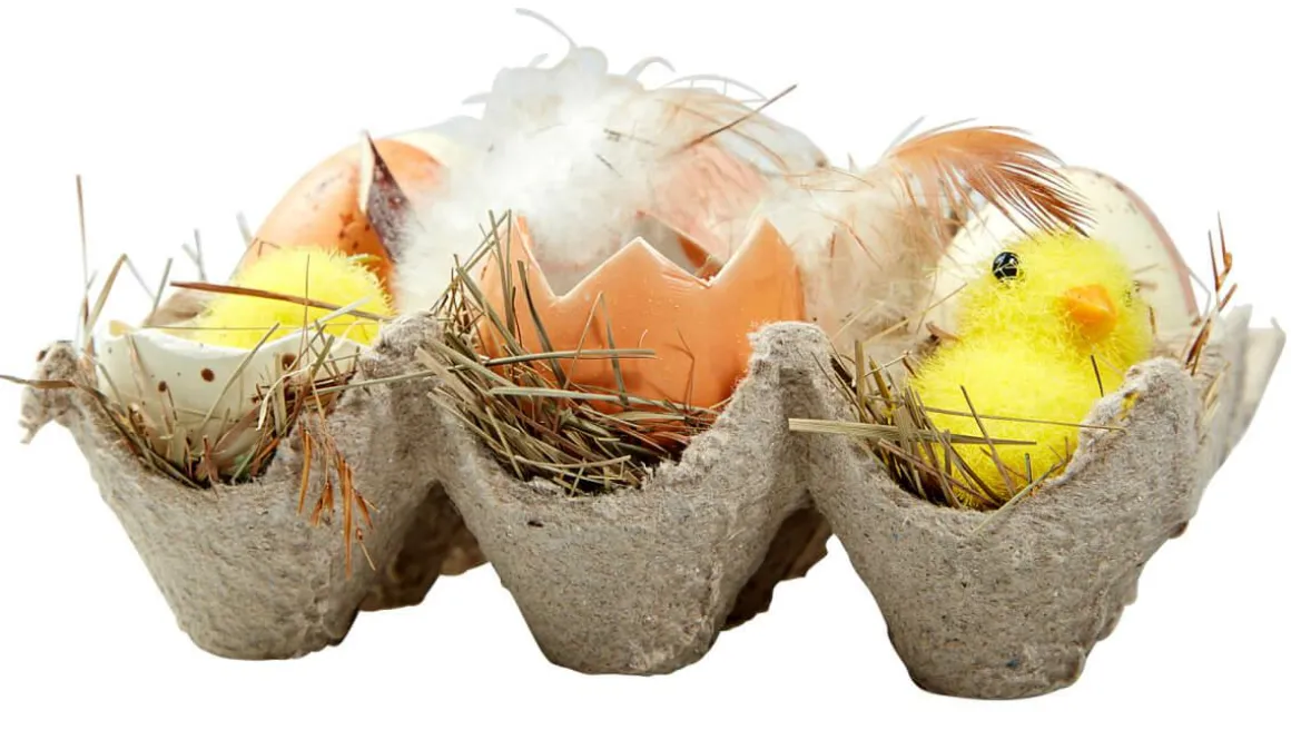 Eierkarton mit neun herausnehmbaren Eiern und Küken, mit Stroh und Federn, Preis per Stück