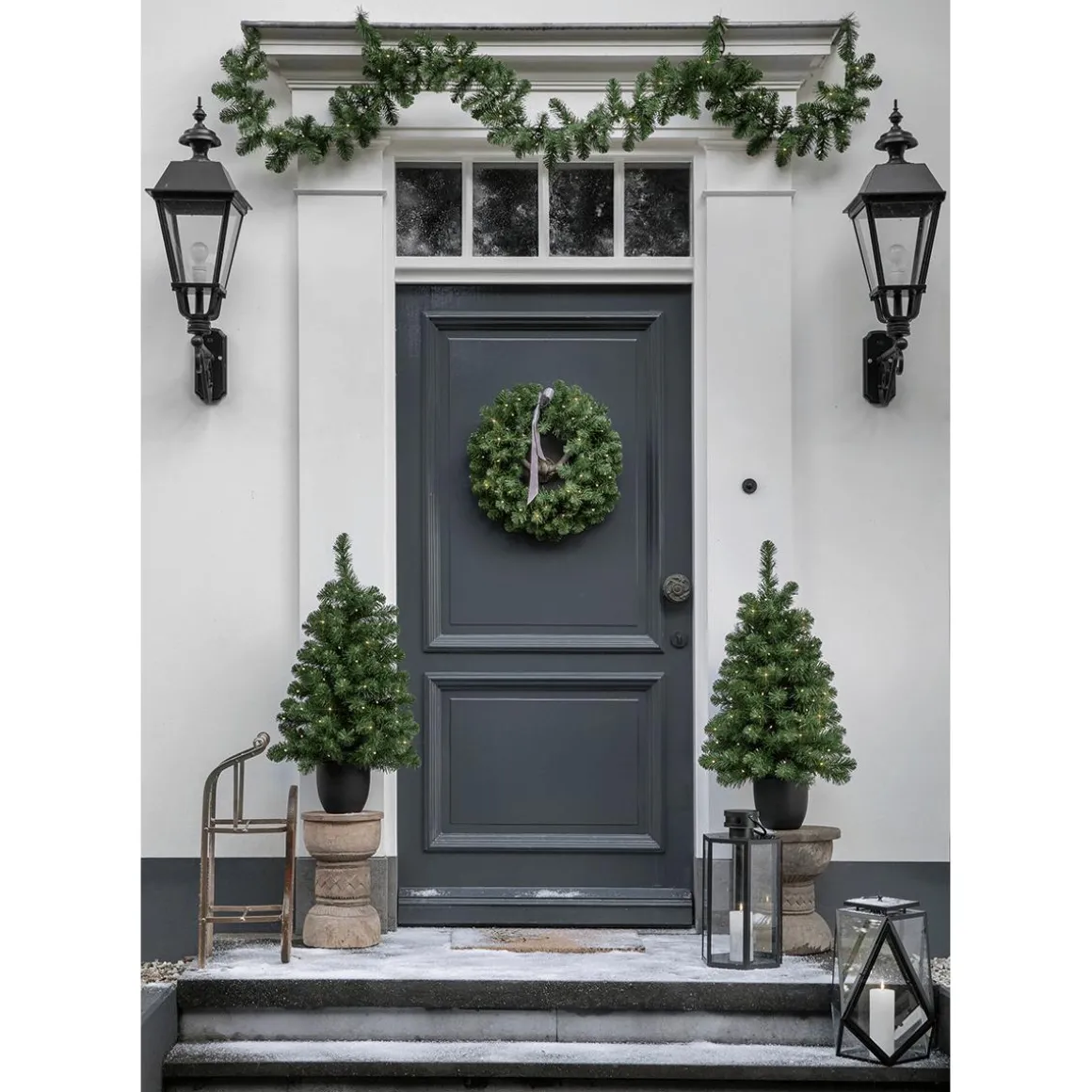 Ob für den Eingang eines Hotels, eines Einkaufszentrums, einer Firma oder für Ihr Zuhause, das weihnachtliche Imperial Batteriebetriebene LED Paketset verwandelt Ihren gewünschten Raum, Eingangsbereich oder Flur in ein wunderschönes Winter-Paradies. Unser Komplettset beinhaltet eine künstliche Tannengirlande, einen wunderschönen Türkranz und zwei fertig eingetopfte Weihnachtsbäume.