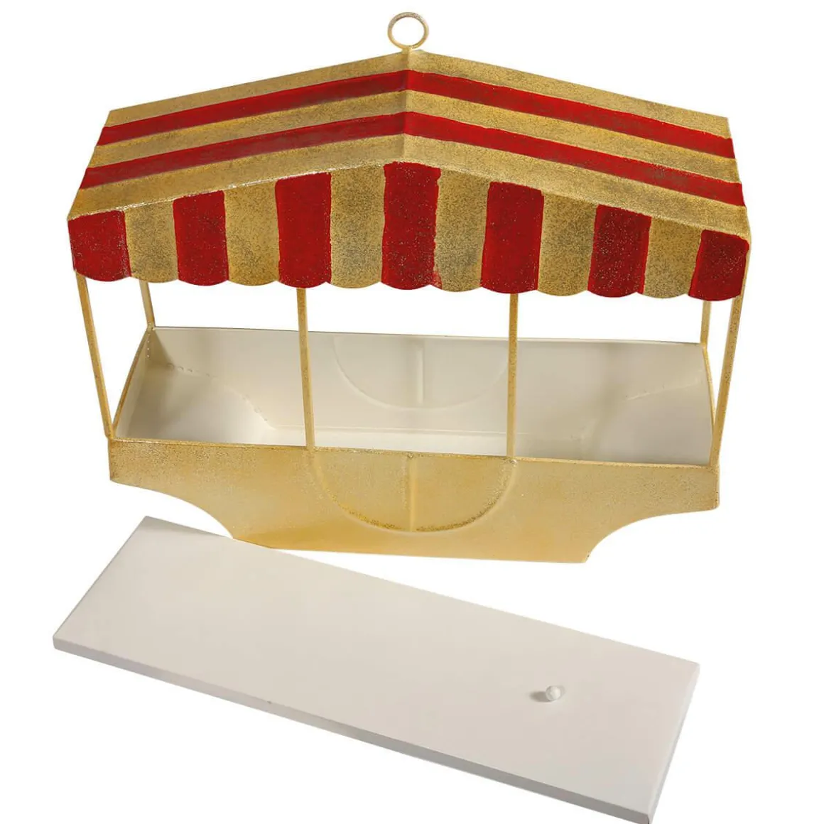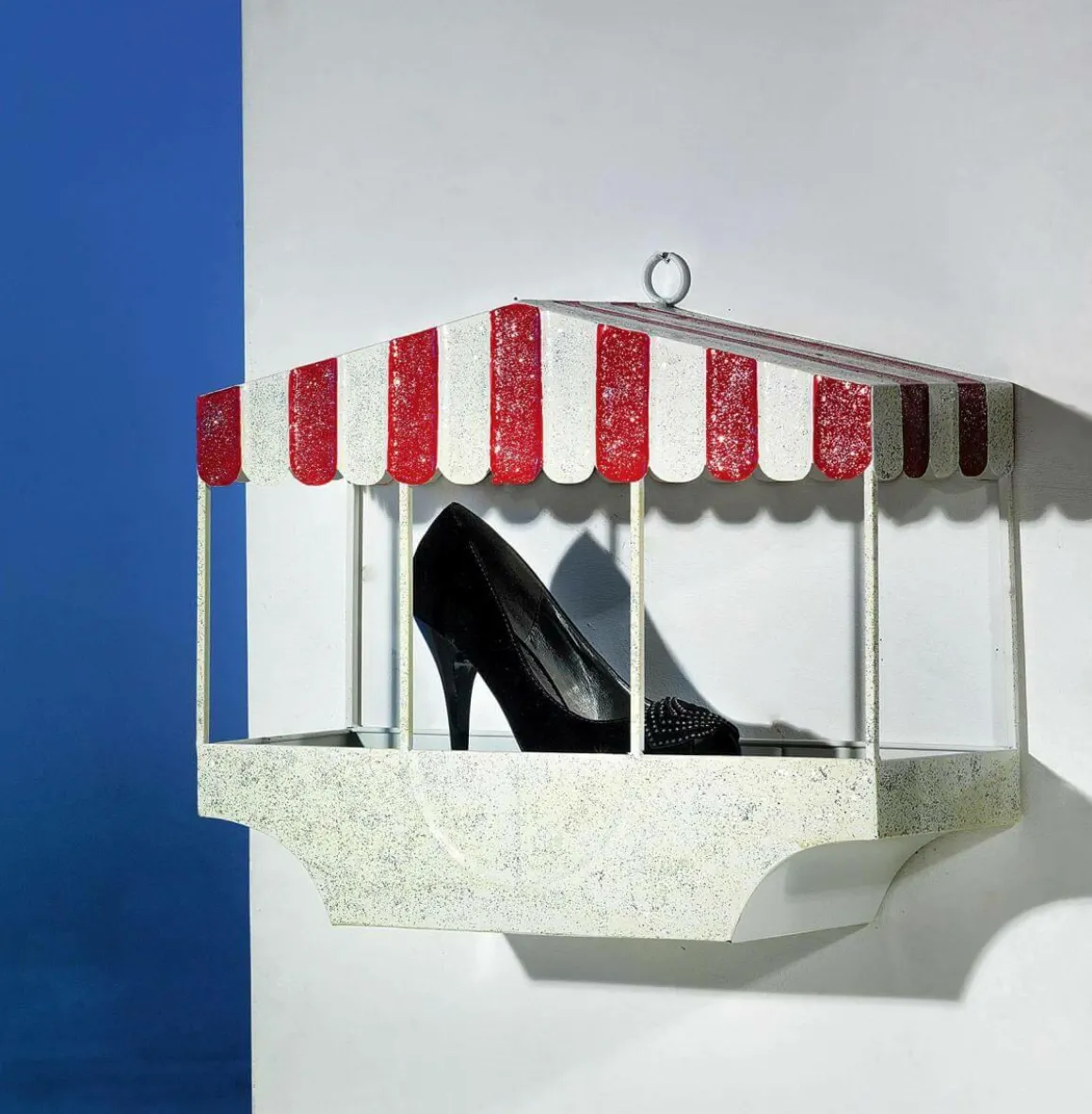 Dieses Retro Wandregal erinnert an die Form einer Riesenrad-Gondel und ist eine tolle Möglichkeit um Dekorationen oder Ware auf besondere Weise in Szene zu setzten. Ein Wandregal, das Funktionalität und Design raffiniert verbindet! Hergestellt aus Metall, verziert mit Glimmer. Einlegeboden und mit Wand-Aufhängung. Preis per Stück.