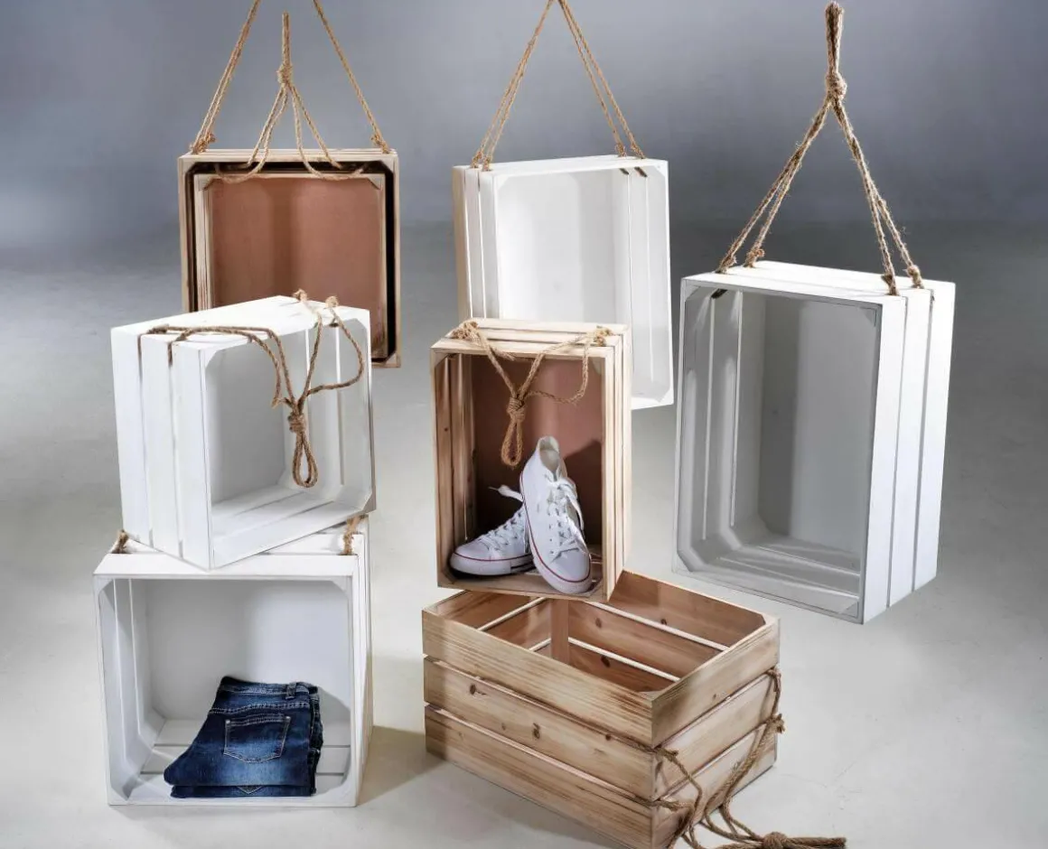 Vielseitig einsetzbare Allzweckkisten mit Jute-Kordel zum Aufhängen. Ob als Hängeregal, Stapelkisten oder als dekorative Holzkisten finden sie in jeder Dekoration Platz. Preis per 2tlg. Satz