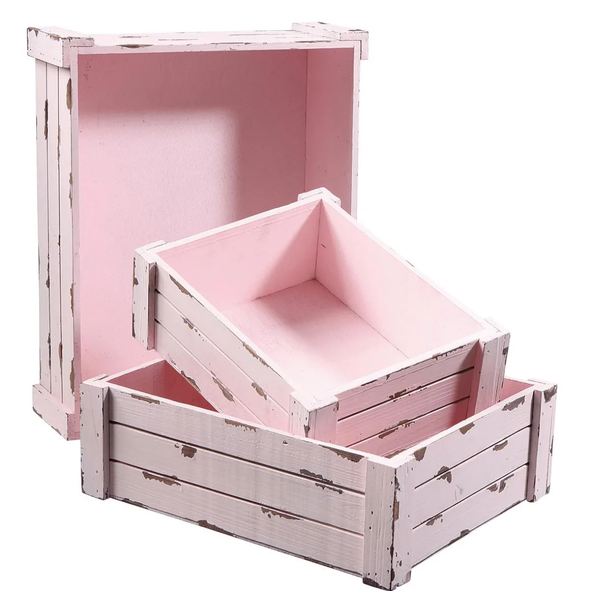 Dekorative, bunte Holzkisten mit gewollt unregelmäßiger Lackierung im Shabby-Chic-Stil. Die Dekokisten eignen sich optimal zum Dekorieren und Präsentieren Ihrer Ware. Als Wandregal, Blumenhalter oder gestapelt, die Holzboxen können sehr vielseitig eingesetzt werden. Maße: 10 x 28 x 22, 11 x 34 x 27,5 und 12 x 40 x 32,5 cm (H x B x T), 7 mm starkes Holz. Preis per 3tlg. Satz.