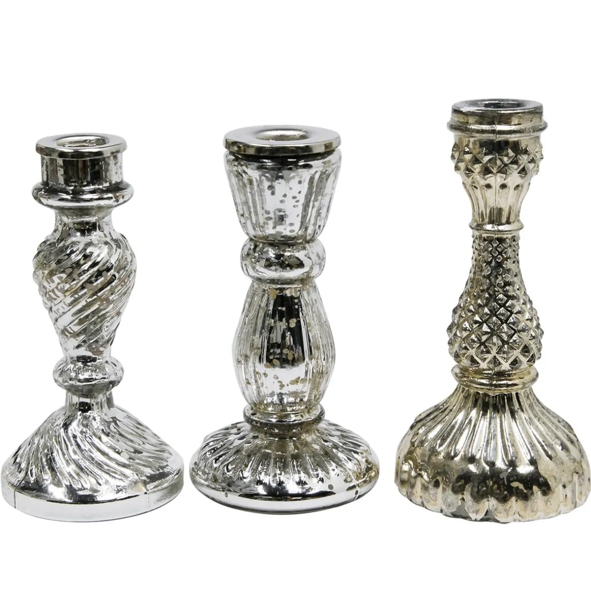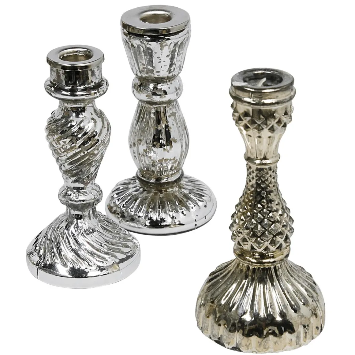 Drei unterschiedliche Bauernsilberglas-Kerzenständer im Antik-Look. Auf einem Sideboard, einem Beistelltisch oder im Regal platziert, sind diese hübschen Kerzenhalter ein edles Deko-Accessoire zu jeder Jahreszeit. Besonders wirkungsvoll kommt das Ensemble gemeinsam arrangiert zur Geltung. Dieses 3-teilige Dekoset in robuster Glas-Qualität ist perfekt für den French, Vintage oder shabby chic Stil. Achtung: die in Handarbeit aufgetragene Bauernsilberschicht ist nicht wasserfest und kann sich bei Kontakt mit Wasser ablösen.