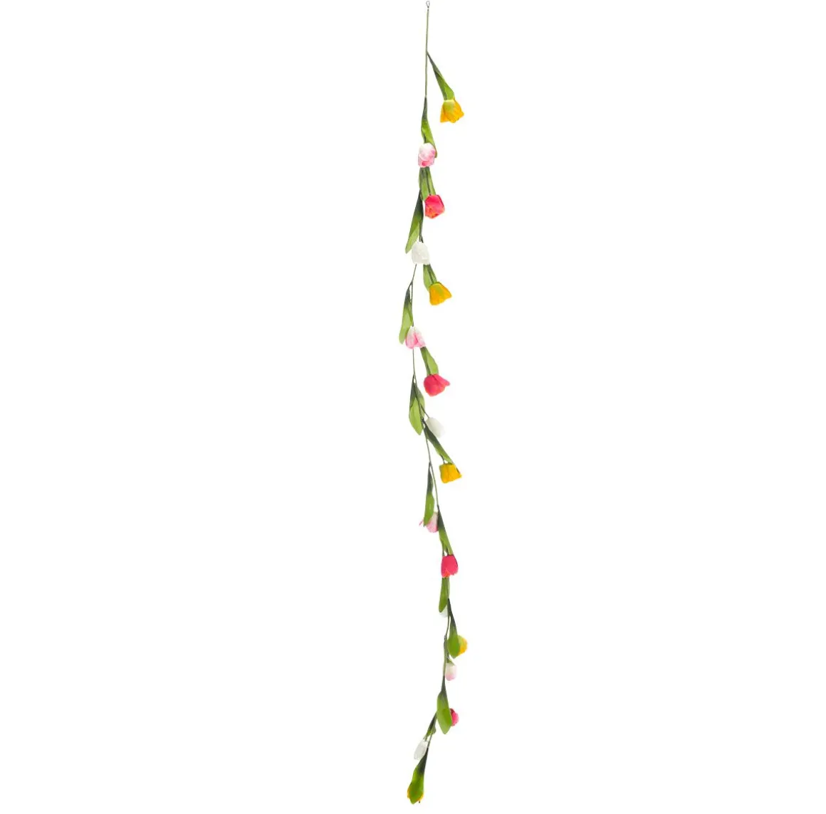 Natur empfundene bunte Tulpenranke, mit rosa, roten und gelben Tulpen, aus Textil, mit praktischer Aufhängung.