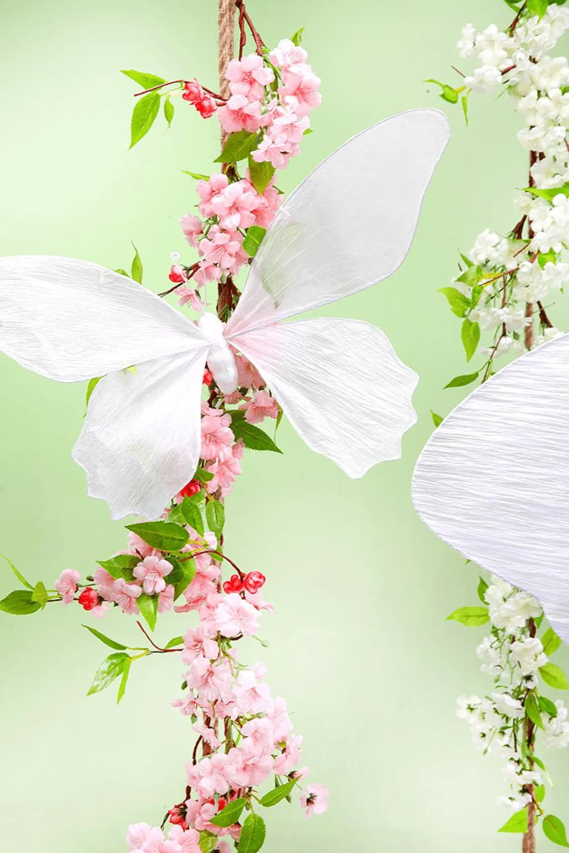 Blumengirlande mit einer großen Anzahl an zarten Blüten und Blättern in frischem grün für elegante Frühlingsdekorationen. Die verzweigte Kunstblumen Girlande ist biegbar und lässt sich hängend oder geschwungen oder als Tischdekoration verwenden. Hochwertige Ausführung aus Textilmaterial und Kunststoff. Preis per Stück.