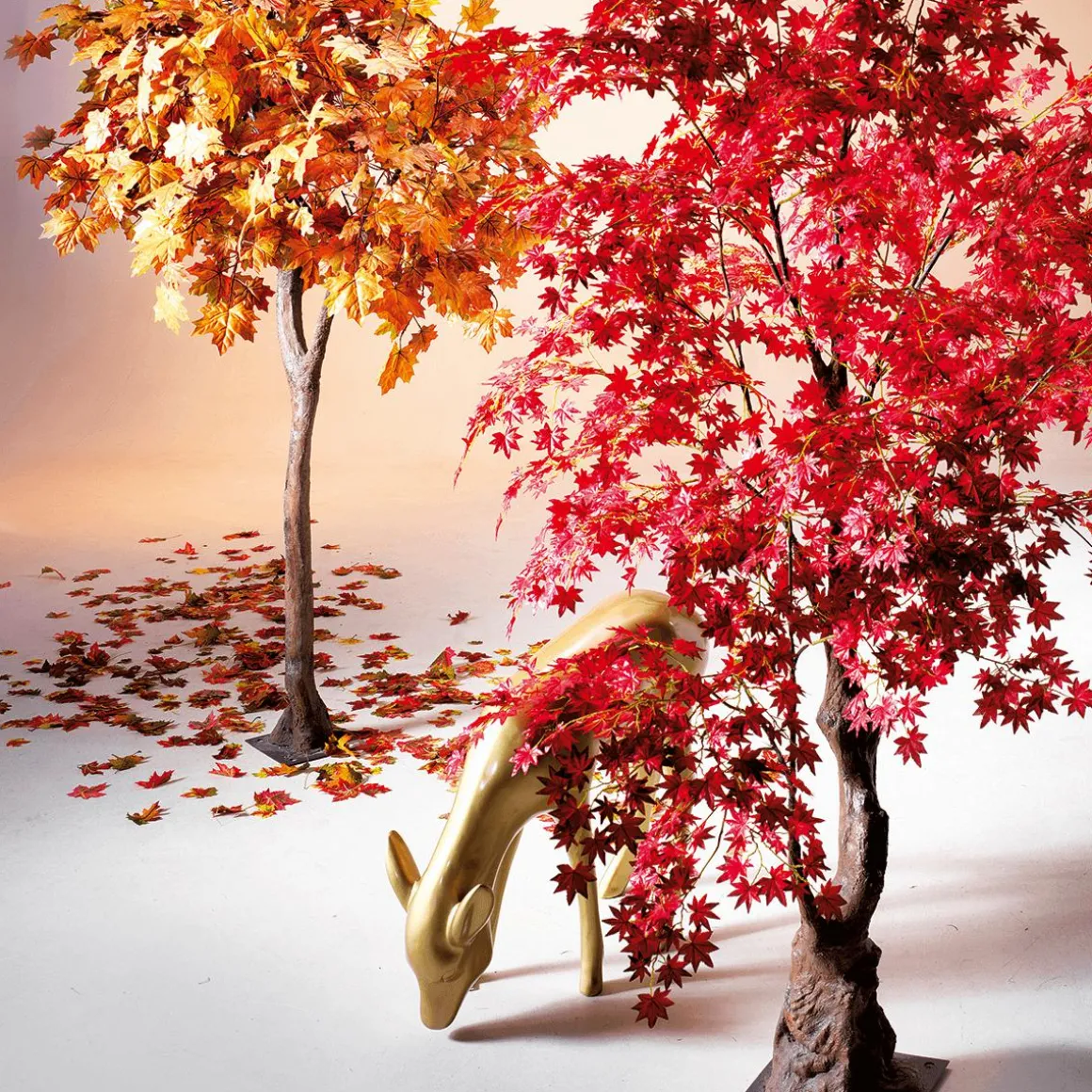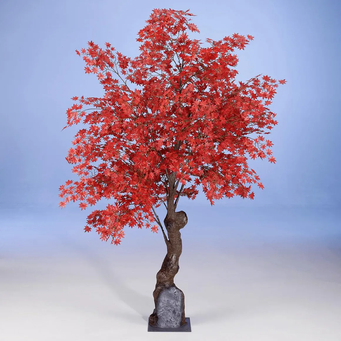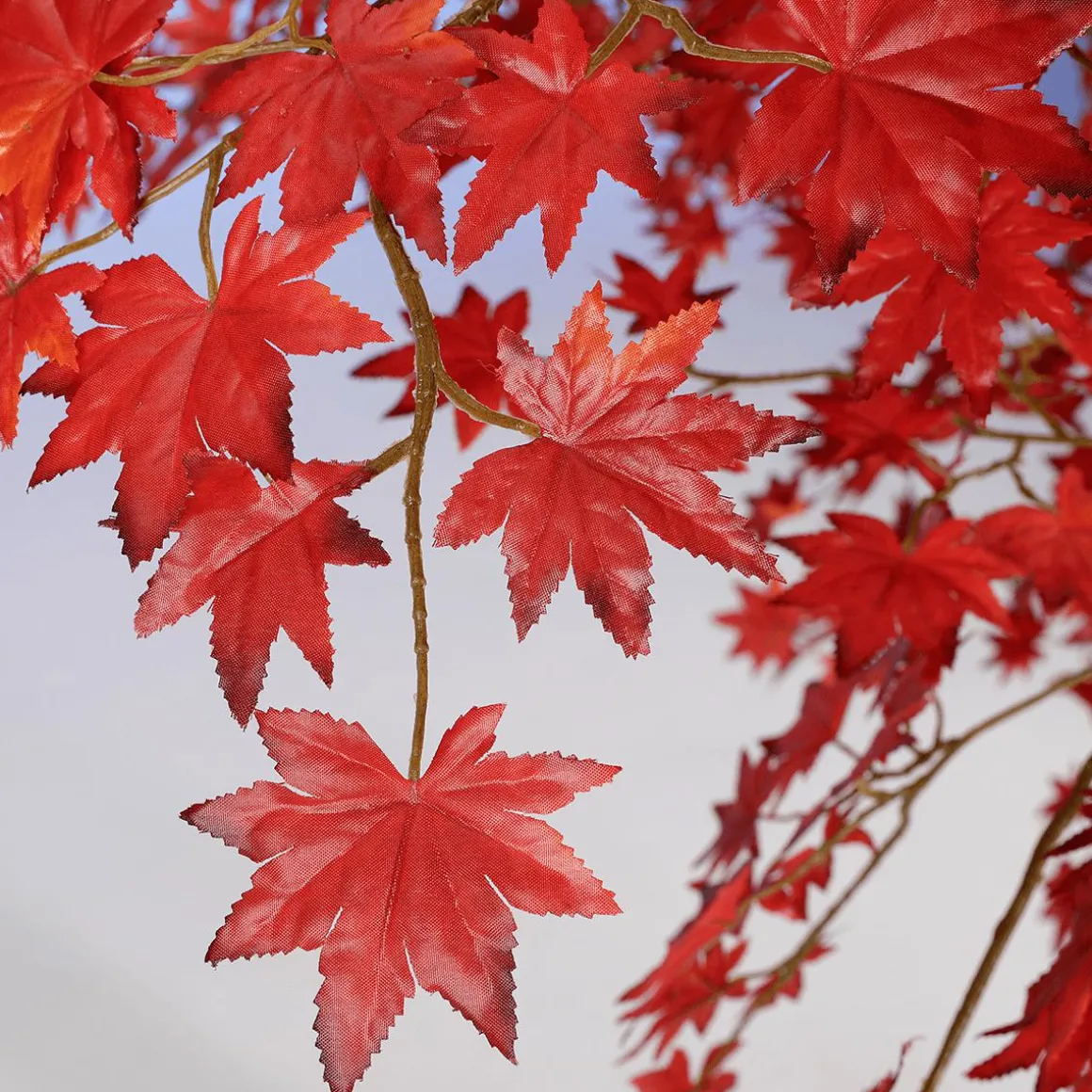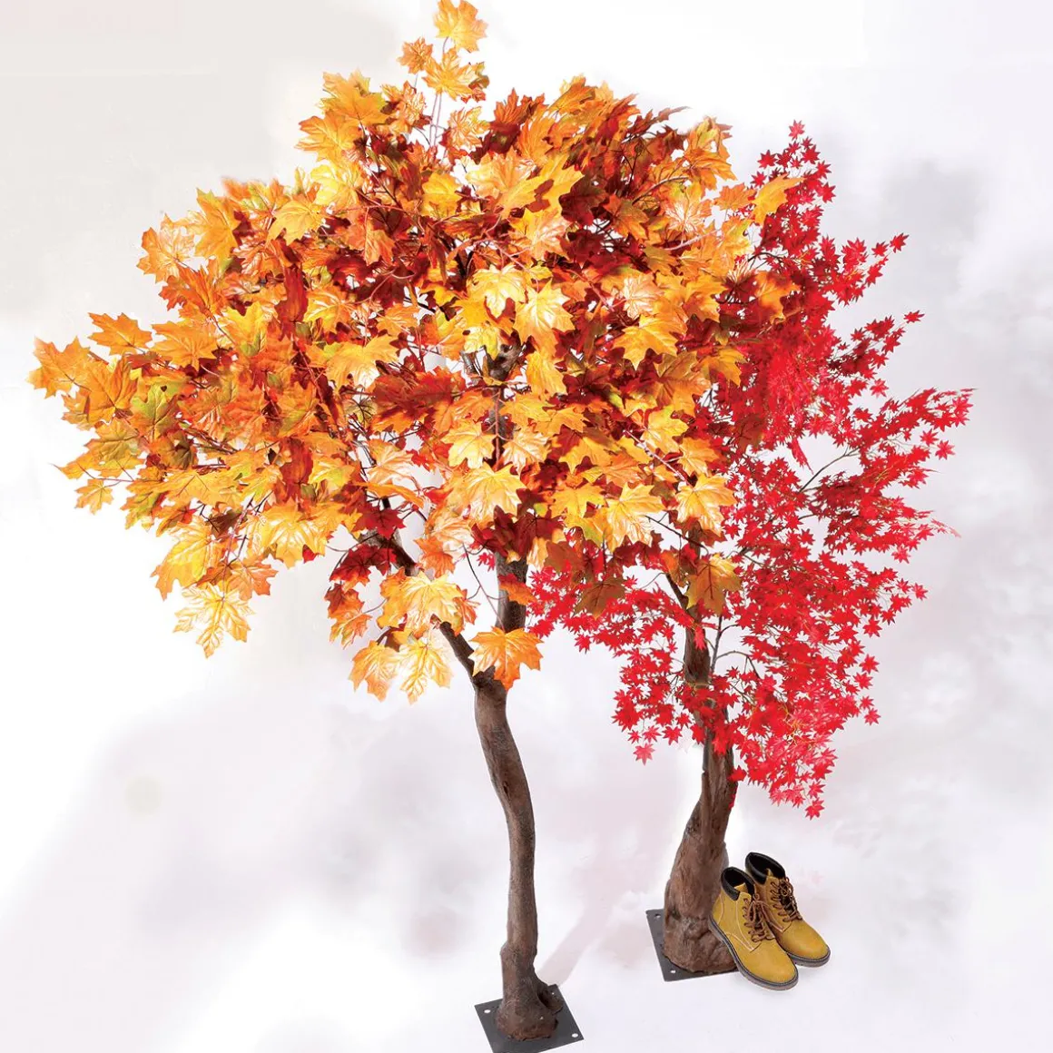 Dieser imposante Herbstbaum eignet sich als pflegelose Deko für den Wellness und Geschäftsbereich sowie im Schaufenster. Die intensive Farbenpracht der ca. 6 cm großen Blätter ist dem japanischen Ahornbaum nachempfunden. Aus hochwertigem Textil sind sie in Farbe, Form, Blattgröße- und Prägung ihren echten Vorbilden zum Verwechseln ähnlich. Der Kunstbaum mit einer Stammhöhe von ca. 60 cm besteht aus einem Kunststoff-Stamm in Holzoptik, auf dem die Blattkrone montiert ist. Die Zweige werden separat geliefert und werden einfach aufgesteckt, so behalten diese ihre Form während dem Transport. Um die Standfestigkeit zu gewährleisten, wird der Baum über die fest montierte Metall-Standplatte (30 x 30 cm) am Boden befestigt. Preis per Stück.