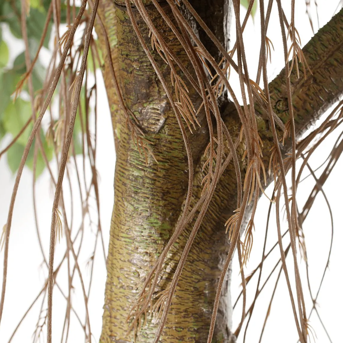 Sehr hochwertig und detailliert verarbeiteter Ficus Kunstbaum, 245 cm hoch, mit einer sehr üppigen Krone und interessantem Stamm. Die Blätter sind aus Textil und der Stamm des Baumes ist aus Kunststoff gefertigt. Der künstliche Ficusbaum ist an einem Ständer befestigt, der mit grünen Eukalyptuszweigen verziert ist.