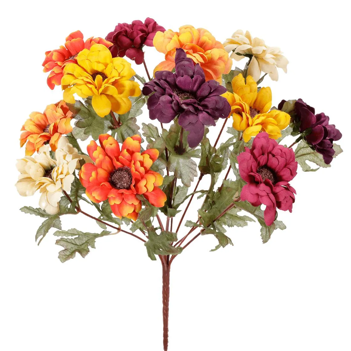 Schöner Kunstblumen-Strauß mit 12 leuchtenden, bunten Zinnien-Blumen die in einem praktischen Steckstab zusammenlaufen. Sehr schön für spätsommerliche und herbstliche Dekorationen. Als Tischdekoration, für Blumengestecke oder für festliche Erntedank-Dekorationen ist der Deko-Strauß bestens geeignet. Kunstblumenstrauß mit ca. 20 cm Ø.