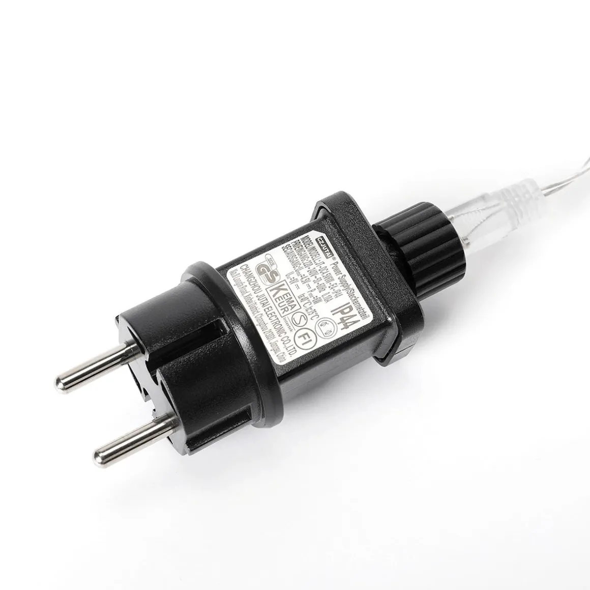 Dekorativer Lichtervorhang aus Silberdraht mit leuchtstarken, integrierten Mico-LEDs. Trafo-Steckernetzteil GS. Preis per Stück.