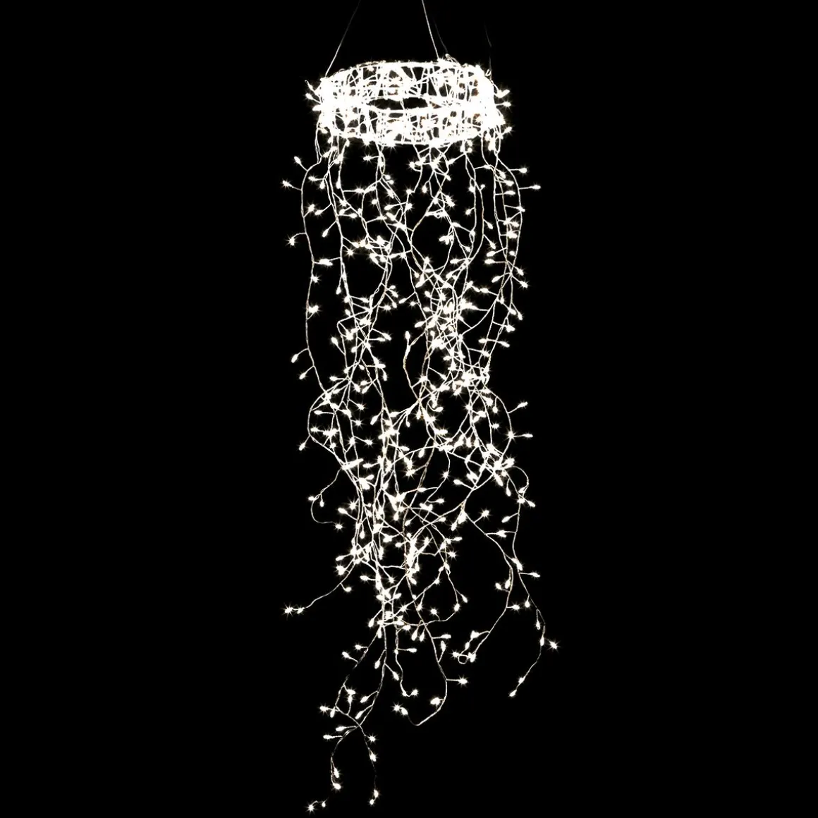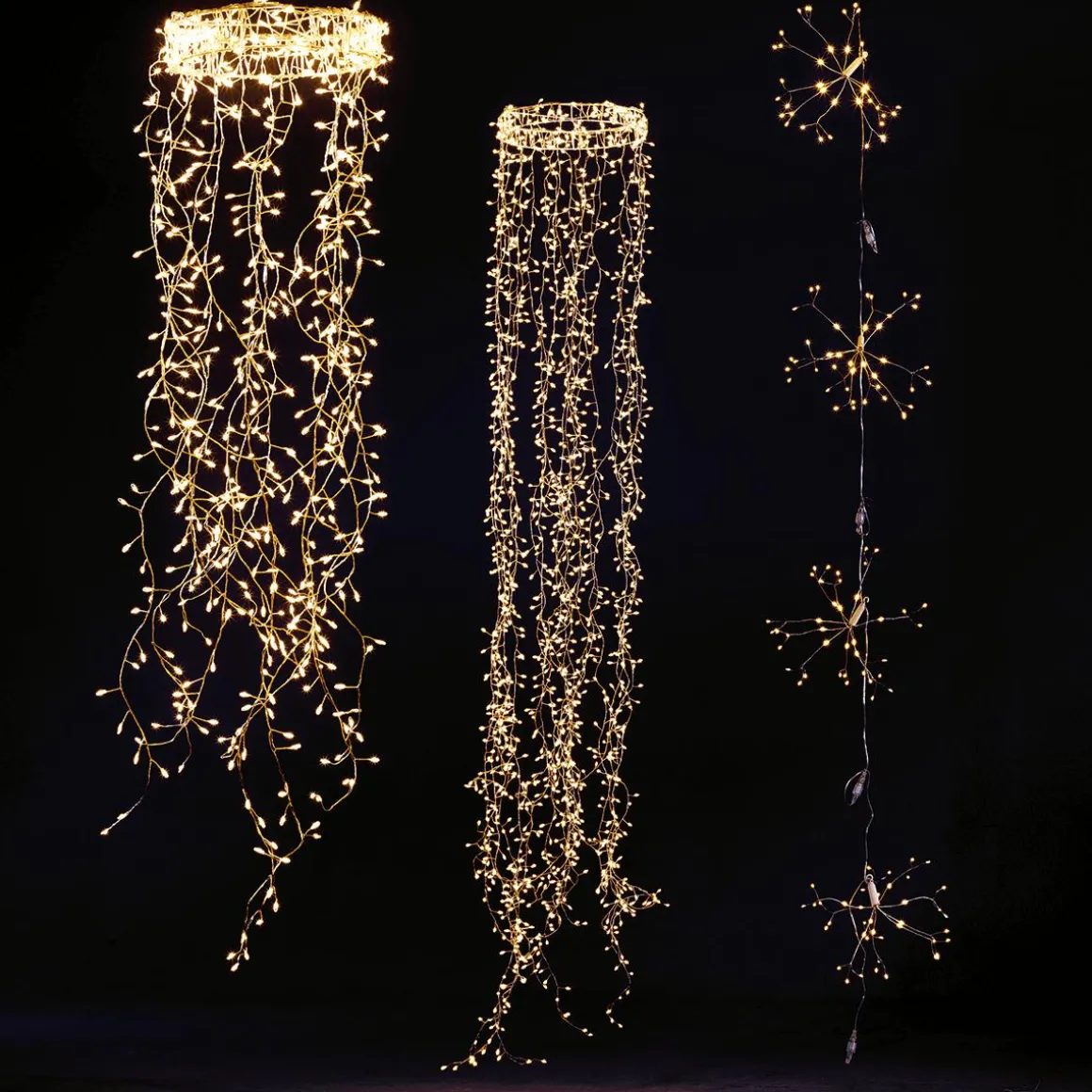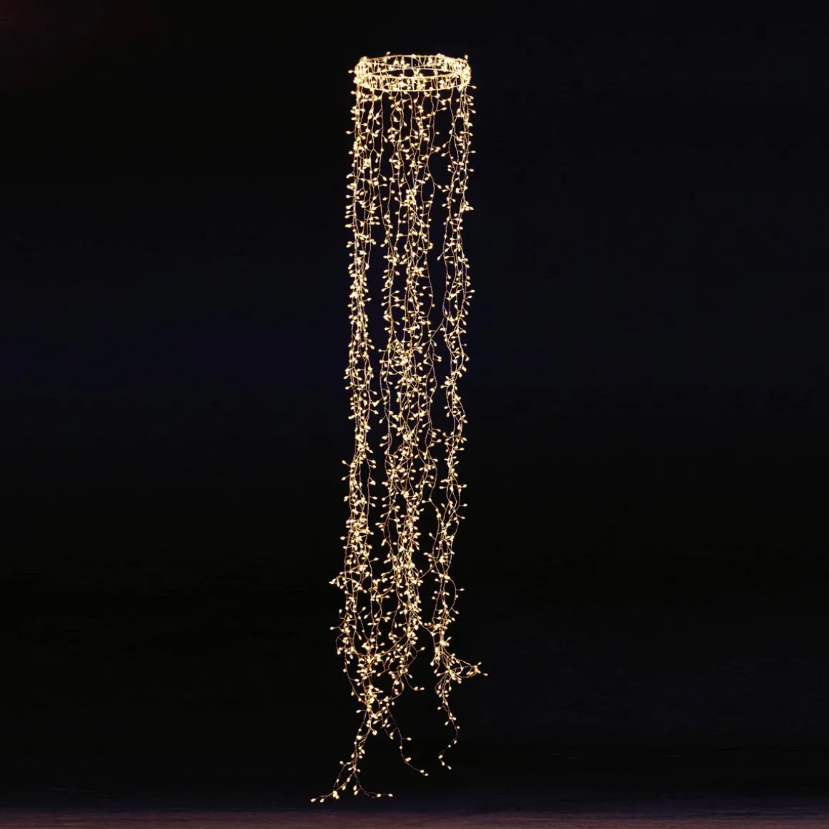 Dekorativer Lichtervorhang bestehend aus einem Metallring mit Aufhängung und unterschiedlich langen Lichterketten aus Silberdraht mit leuchtstarken, integrierten Mico-LEDs. Diese befinden sich an kleinen Abzweigen des Hauptstrangs. Trafo-Steckernetzteil GS. Preis per Stück.