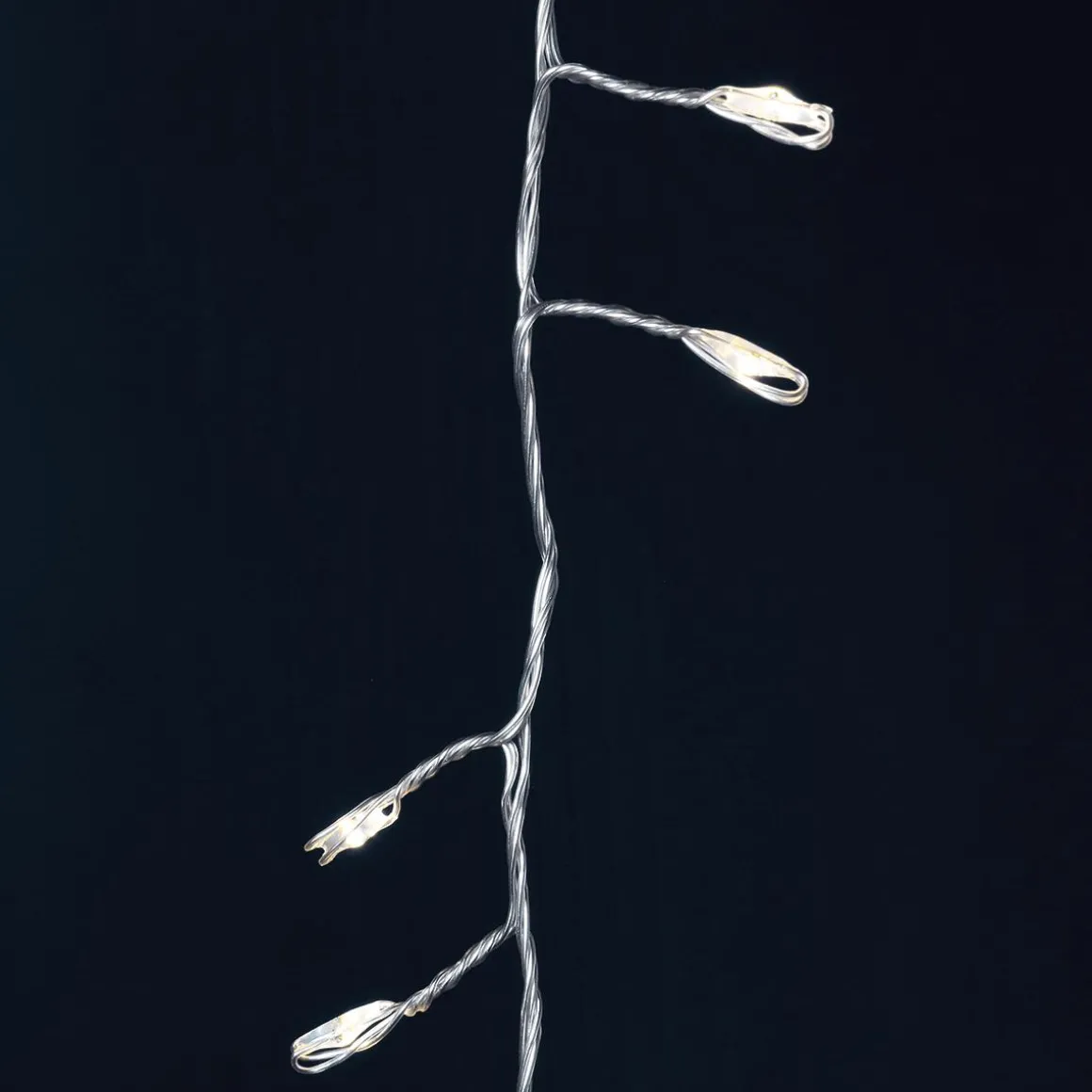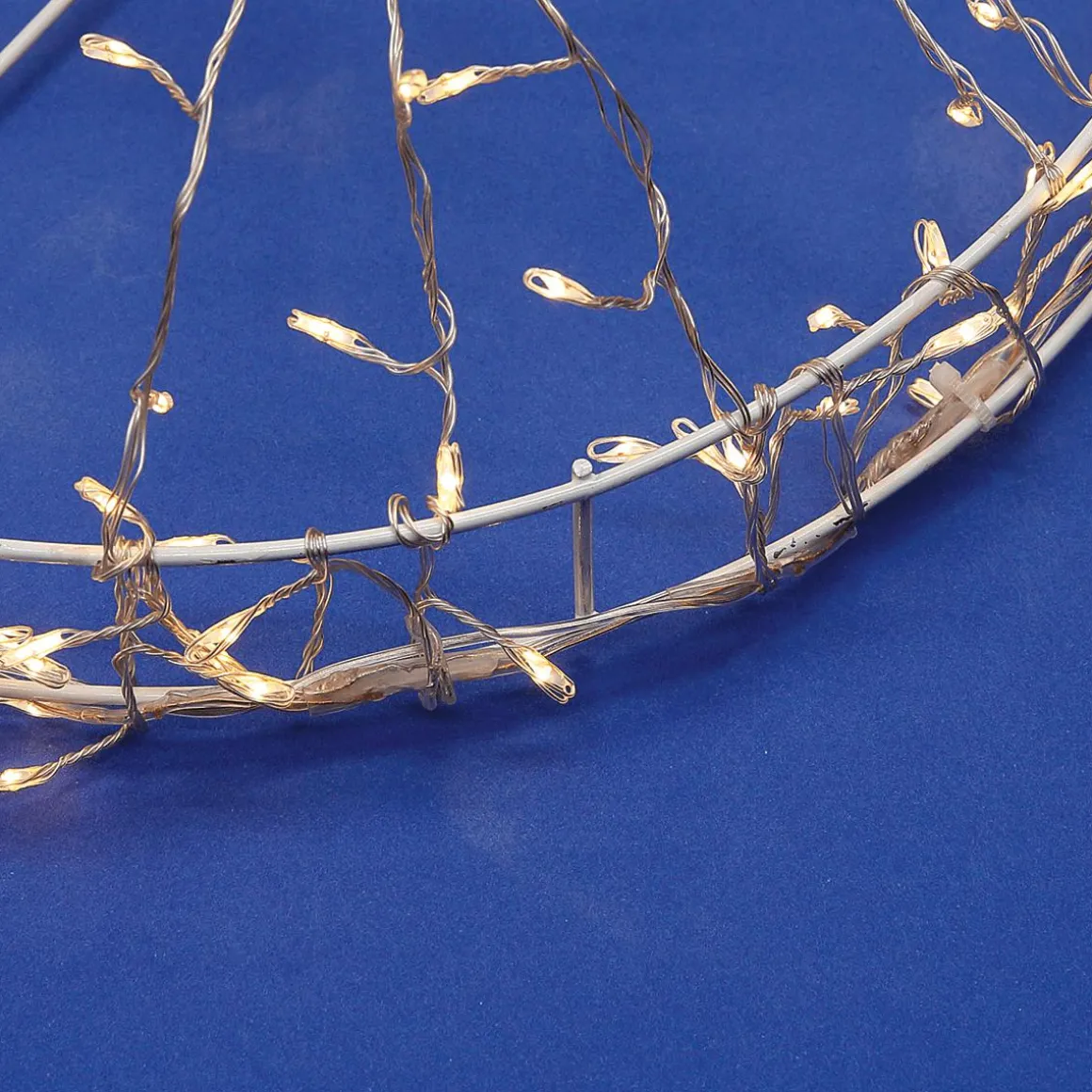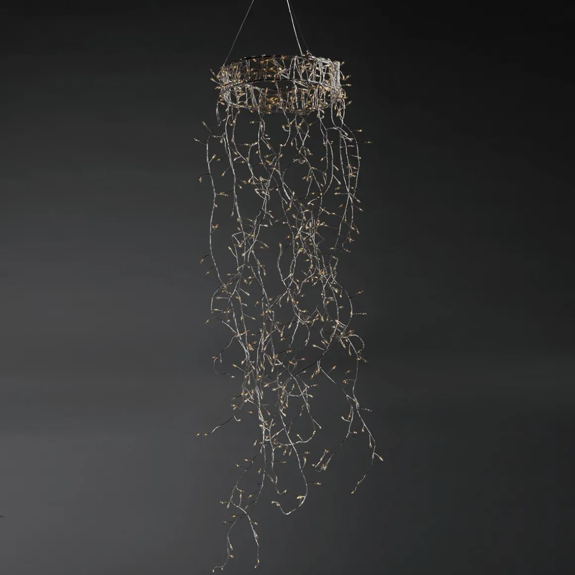 Dekorativer Lichtervorhang bestehend aus einem Metallring mit Aufhängung und unterschiedlich langen Lichterketten aus Silberdraht mit leuchtstarken, integrierten Mico-LEDs. Diese befinden sich an kleinen Abzweigen des Hauptstrangs. Trafo-Steckernetzteil GS. Preis per Stück.