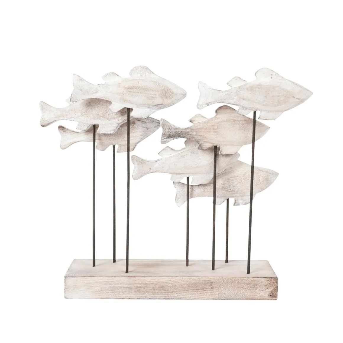 Maritimes Holzdisplay mit 7 geschlitzten Holzfischen, die auf Metallstäben in verschiedenen Höhen befestigt sind. Die maritime Dekoskulptur ist eine besondere Dekoration für das Zuhause, als Geschenk oder als Dekorationsobjekt in Restaurants und öffentlichen Einrichtungen.
