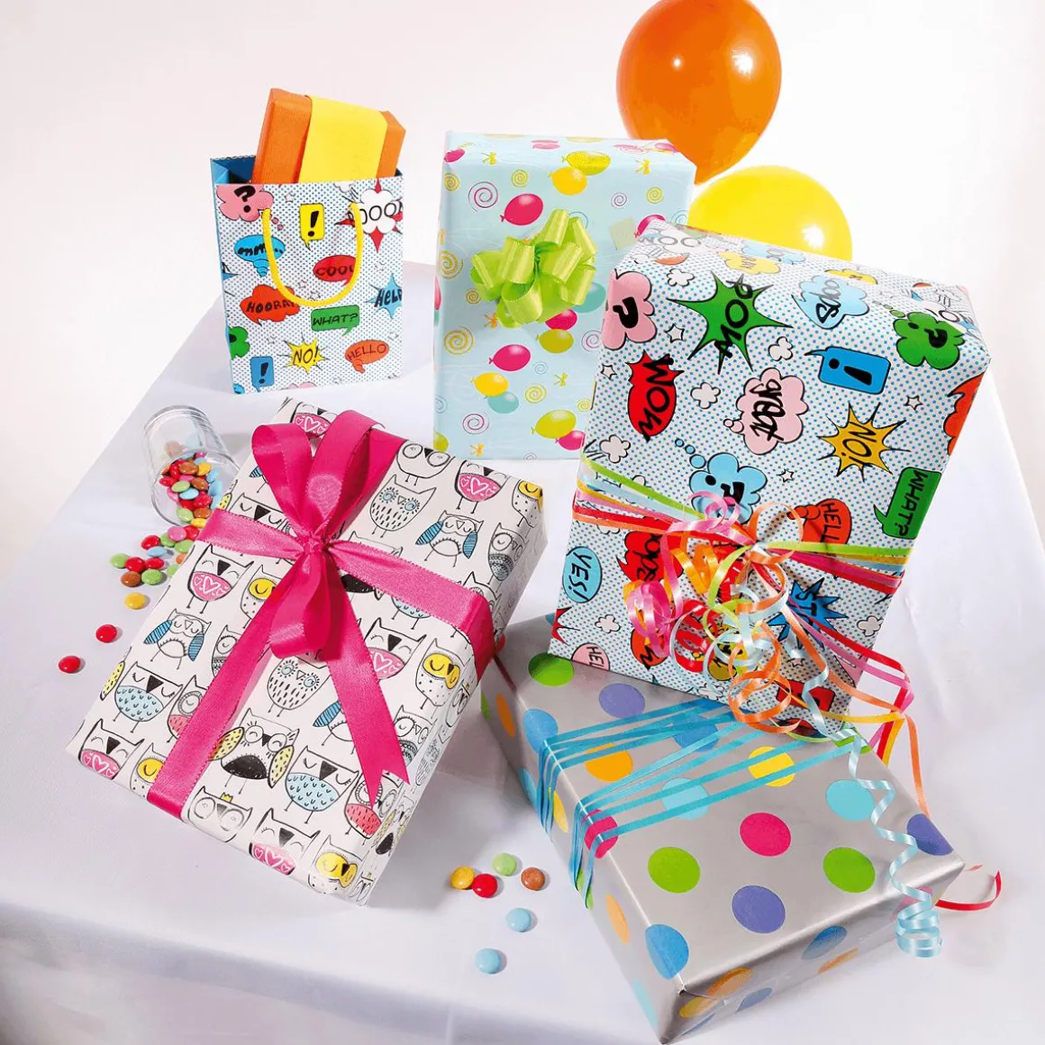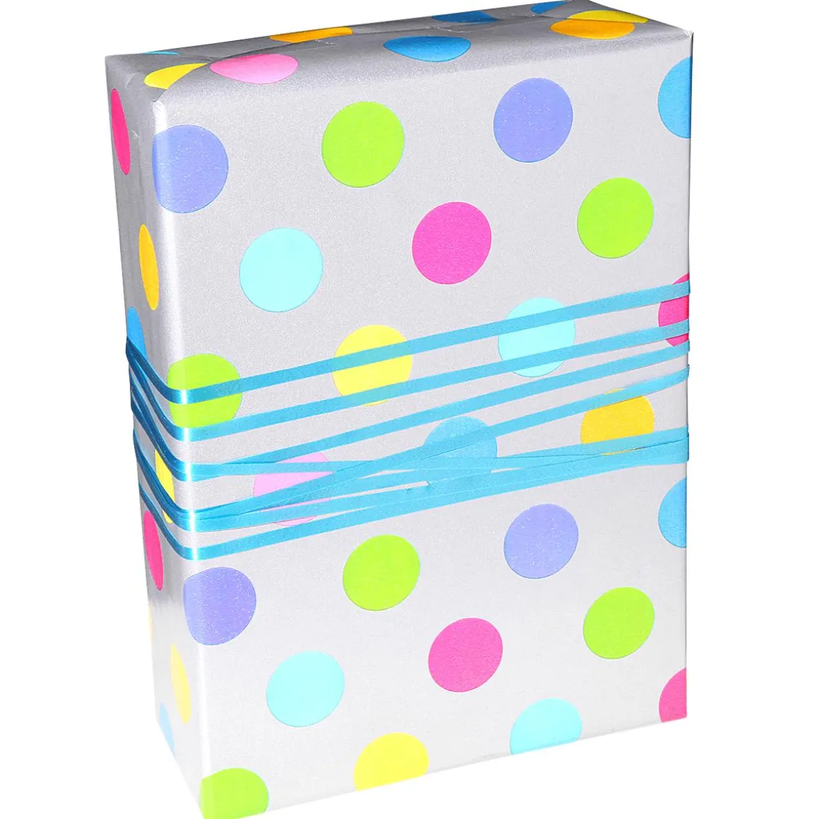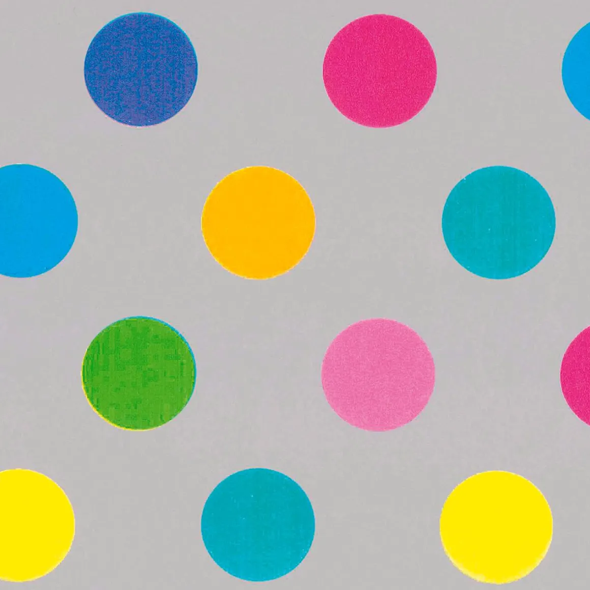 Zu jedem Anlass passend: ökologisches Geschenkpapier mit silbernem Hintergrund & bunten Punkten
