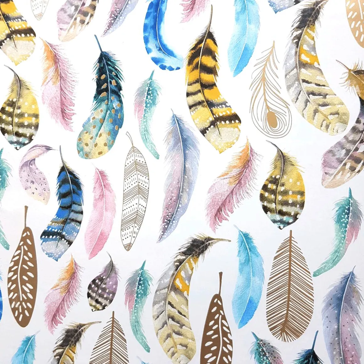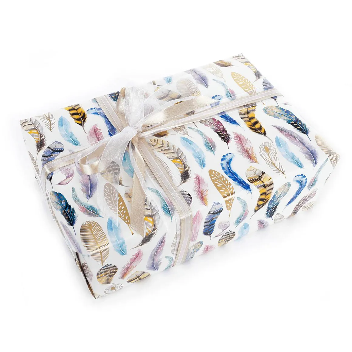 Natur de Luxe: Ökologisches Geschenkpapier mit bunten Federn und golden schimmernden Highlights