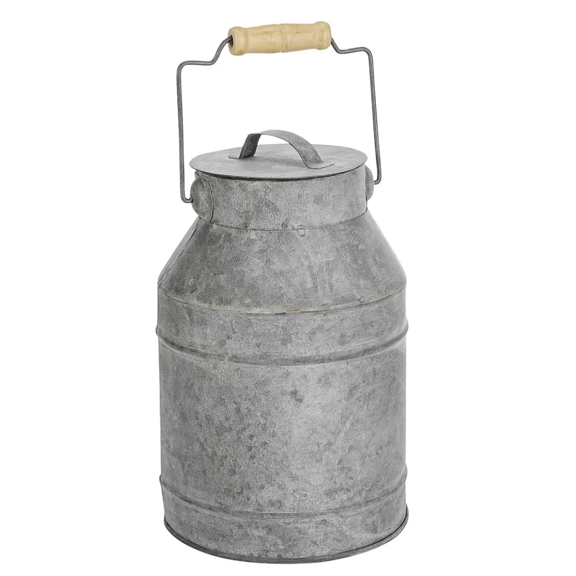 Nostalgischer Milchkrug aus verzinktem Metall mit Henkel und Deckel, 9 x 22 cm. Der Deckel ist abnehmbar und mit einer Kette an der Kanne befestigt.
