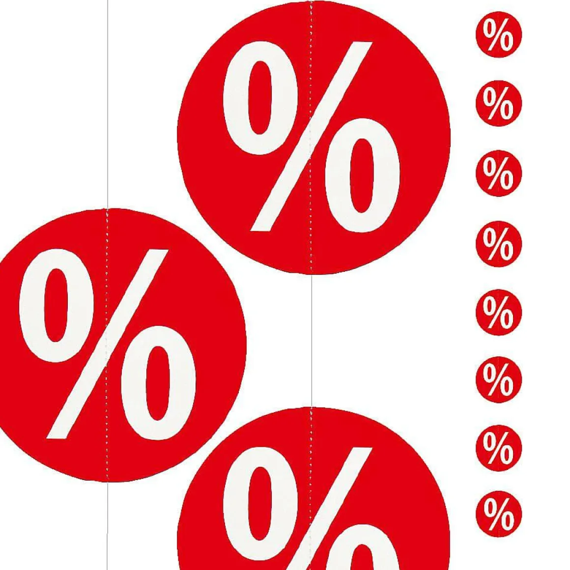Deko Girlanden sind effektive Werbemittel und ermöglichen eine schnelle und verkaufsorientierte Gestaltung am Point of Sale. Die auffallende Hänge-Dekoration zieht kauffreudige Kunden an und erhöht die Sichtbarkeit Ihrer Sale und Rabatt-Aktion. Die Kette besteht aus beidseitig bedruckten Karton-Kreisen mit Prozentzeichen-Aufdruck. Praktisch und immer wieder verwendbar. Preis per Stück.