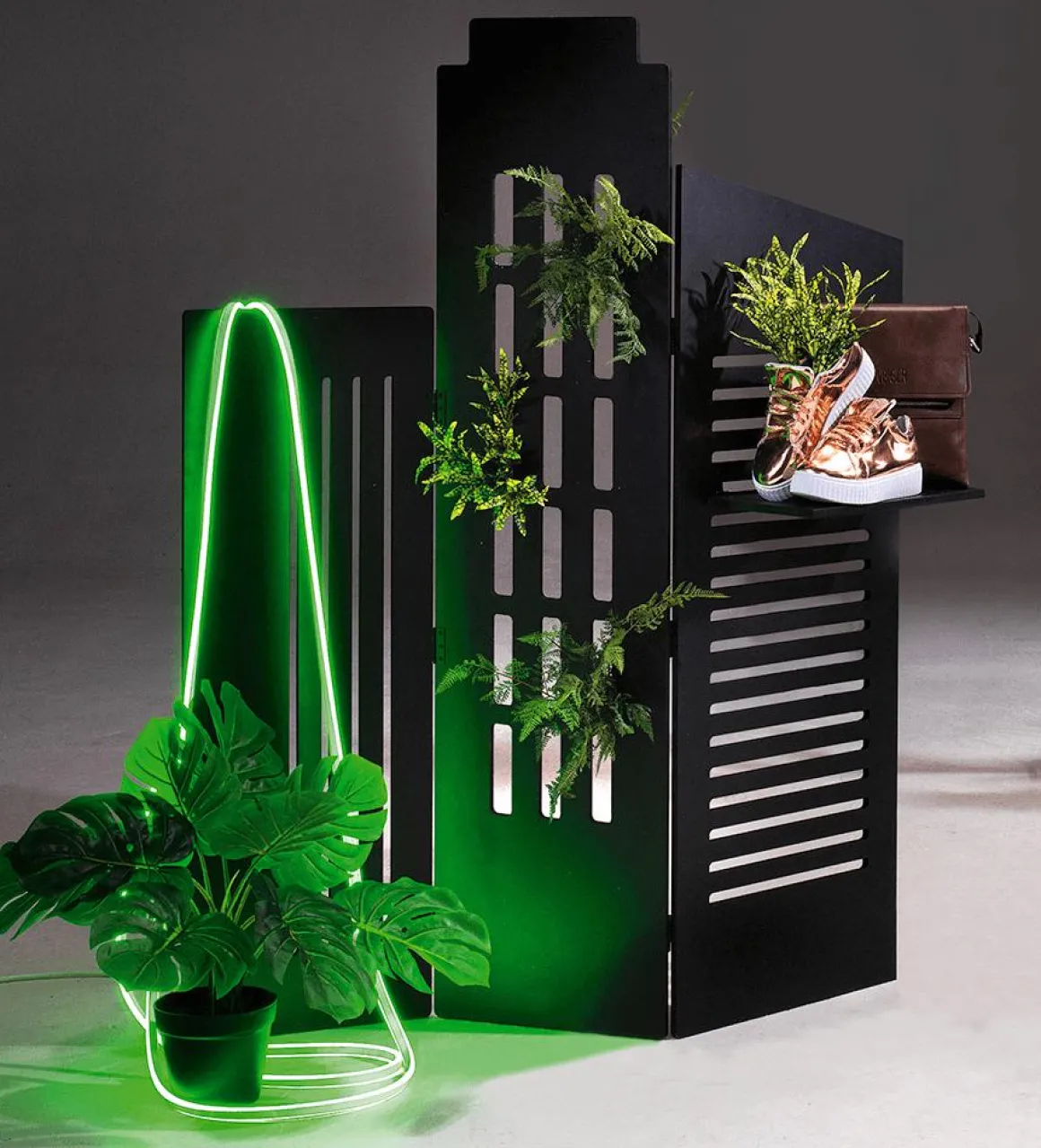 Deko-Objekt und individueller Sichtschutz in einem, mit Regalbrett (30 x 20 cm) zum variablem Einhängen, leicht aufzustellen, nach Gebrauch problemlos und platzsparend zusammenklappbar, aus 1,3 cm starkem Holz, beidseitig lackiert, Preis per Stück