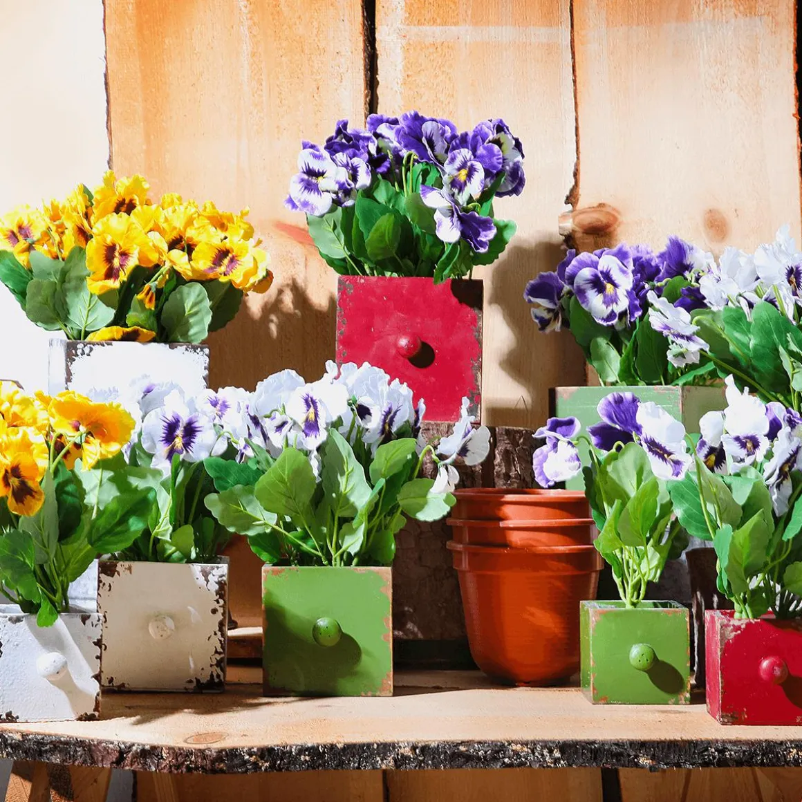 Dekorative Pflanz-Schubladen aus Holz im angesagten Shabby-Chic-Look. Die Kisten sind mit Folie ausgekleidet und können somit zum Bepflanzen, aber auch zum Dekorieren genutzt werden. Gebrauchsspuren sind gewollt und stellen keinen Reklamationsgrund dar. Preis per 3tlg. Satz