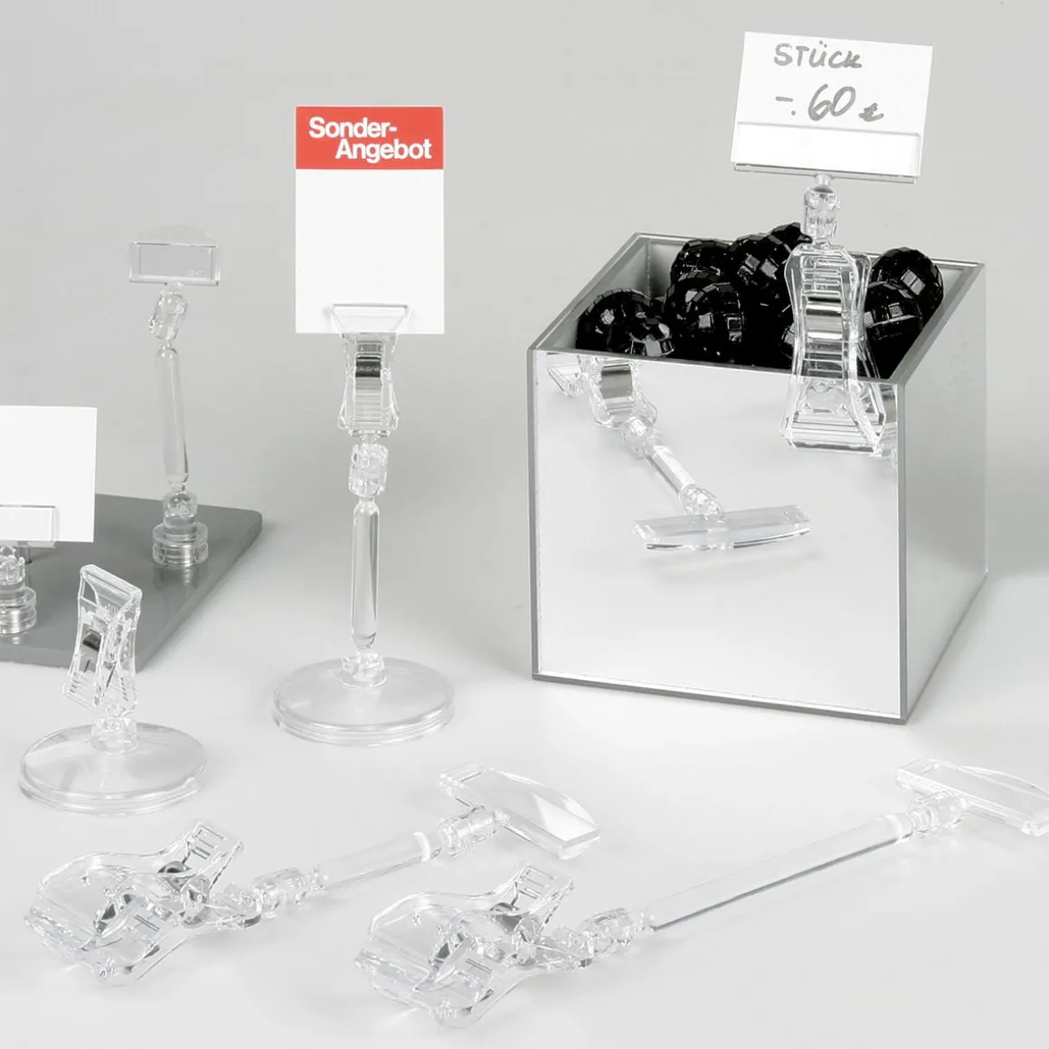 Schildhalter für eine schnelle und flexible Preisauszeichnung, mit beweglichem Kugelgelenk für passgenaue Ausrichtung, zum Beispiel als Kistenhalter, Tellerfuß 5 cm Ø, hochwertige Qualität aus glasklarem Polycarbonat, Made in Germany, Preis per Stück