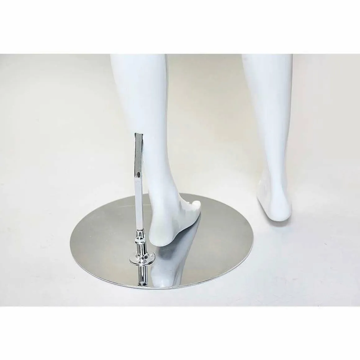 Weibliche, faceless, highglossy Schaufensterpuppe mit Flipflop-Zehen und schlanker Passform in eleganter Position. Das Mannequin hat einen vollplastischen Körper aus reinweißem Fiberglas. Inkl. Wadenpin und verchromter Metallplatte. Preis per Stück.