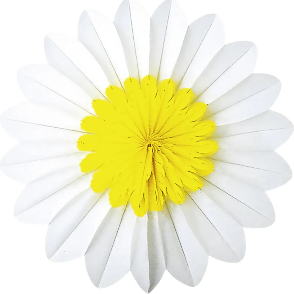 Unsere Party Margeritenblüte-Papierrosetten haben einen Durchmesser von 50, 70 oder 90 cm und sind sehr schnell und einfach zu öffnen und aufzuhängen.