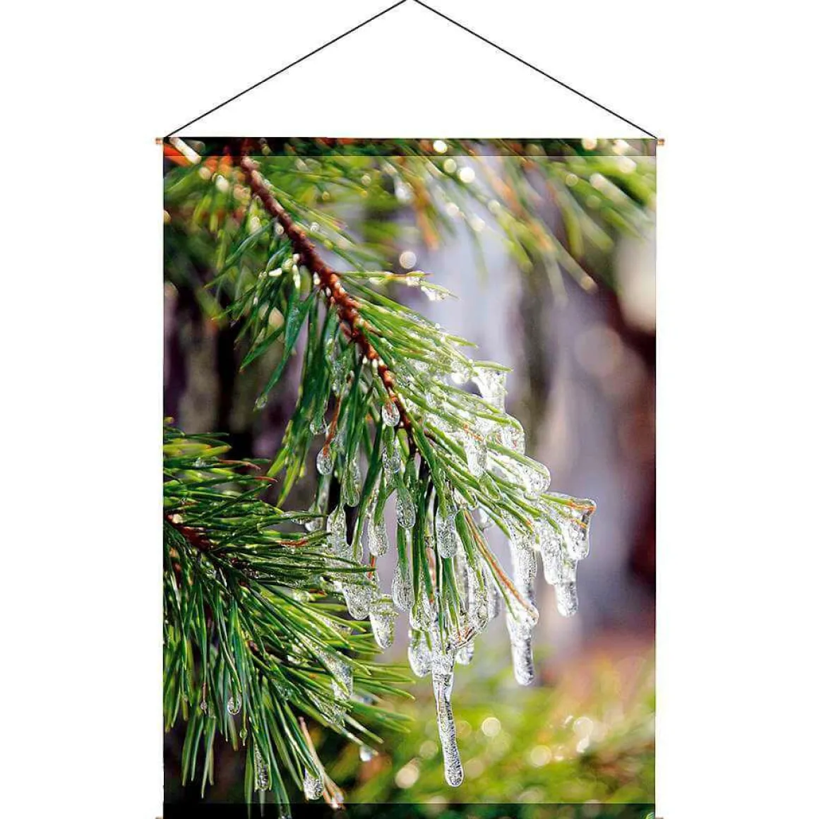 Frostig schön, natürlich ansprechend: Dieses Stoffbanner fokussiert sich ganz auf ein paar Tannenzweige im Wald, an denen sich Eiszapfen gebildet haben. Obwohl der Farbtenor des Motivs überwiegend Grün ist, wird durch die silbrig-glitzernden Eiszapfen winterliches Kolorit vermittelt. Ein Deko-Motiv für die kalte Jahreszeit, das ganz ohne Schneeweiß auskommt. Motto: Grün ist die Hoffnung!