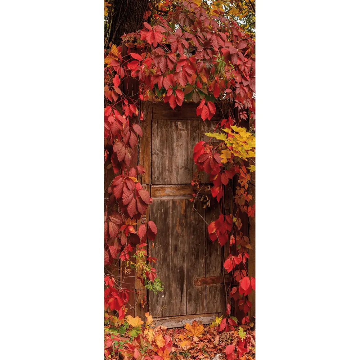 Die ganze üppige Farbpracht des Herbstes kommt auf diesem Textilbanner zum Strahlen! Eine Holztür ist über und über mit rotem Wein bewachsen. Dieser strahlt in leuchtendem Dunkelrot. Blattwerk im Hintergrund sowie am Boden rundet das faszinierende Herbstmotiv um weitere Orange-Rot-Gelb-Nuancen ab. Ein (herz-)erwärmender Anblick, der uns die Kreativität der Natur dekorativ vor Augen führt. Die schönsten Farben dieser Jahreszeit – vereint in einem Motiv.