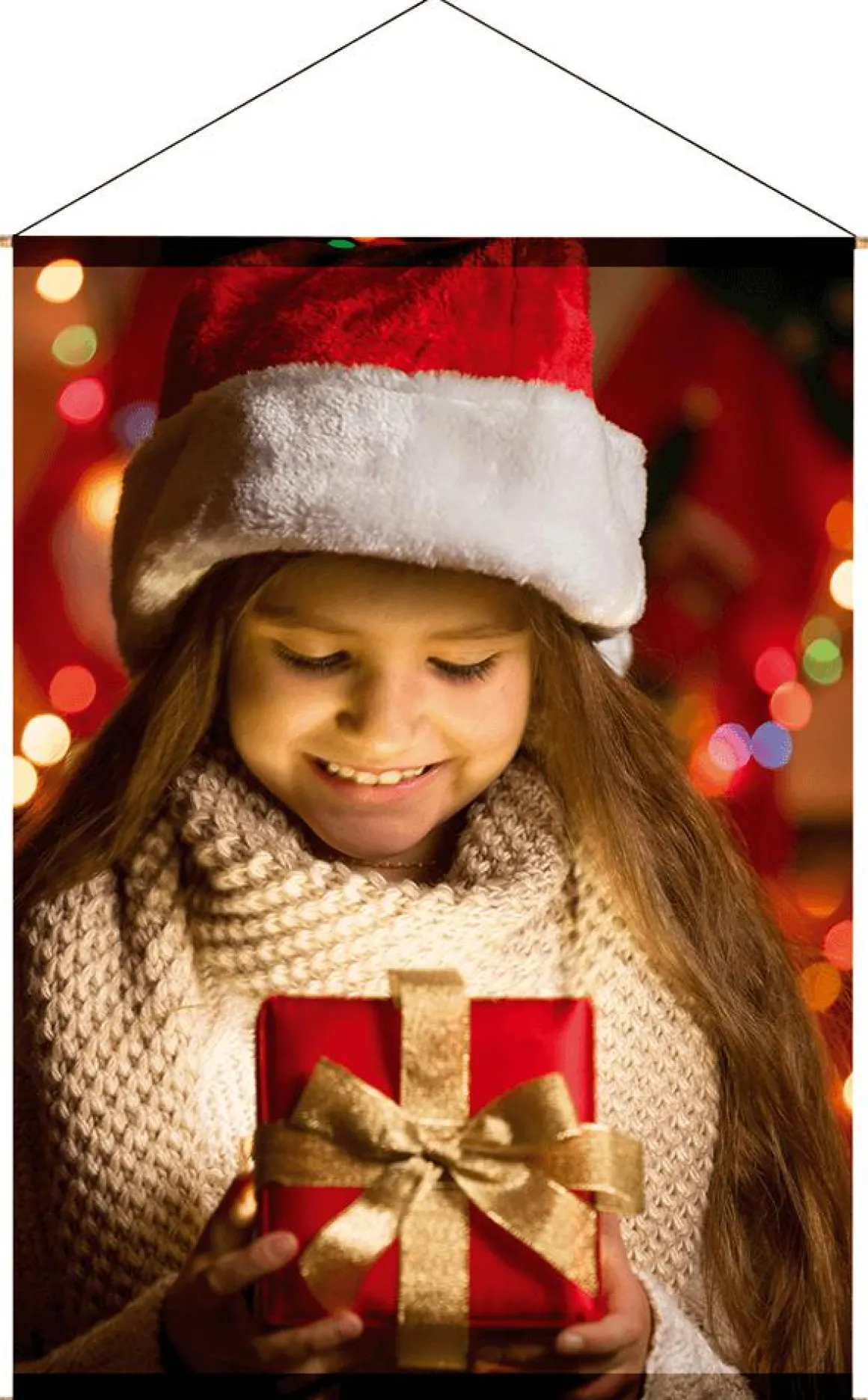 Weihnachten lässt Kinderaugen strahlen! Vor allem, wenn es an das Auspacken der Geschenke geht. Diesen glücklichen Moment fängt unser Stoffbanner ein. Ein junges Mädchen öffnet eine verpackte Geschenkschachtel. Was sich darin befindet, bleibt den Betrachtern verborgen. Doch das begeisterte Gesicht spricht Bände… Neben der herzlichen Thematik besticht das Motiv durch seine Farbharmonie. Die Farben Rot und Gold wechseln spielerisch zwischen Päckchen, Schleife, Pulli und Mütze. Ein Textilposter, das Herzen öffnet.