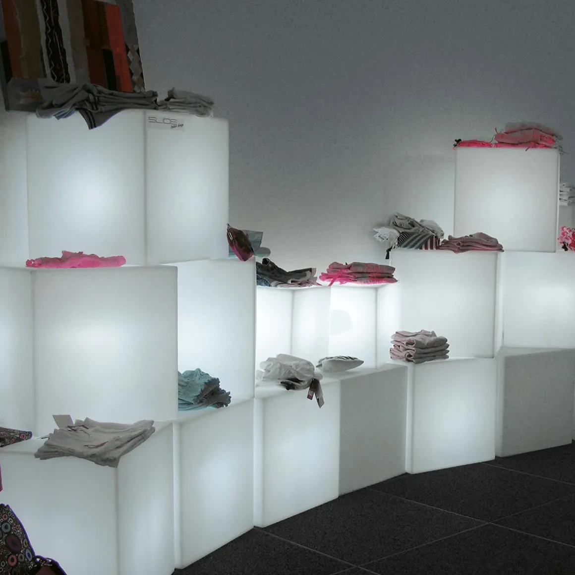 Ob als Sitzmöbel, als Beistelltisch oder zu Lichtwänden gestapelt – die Einsatzmöglichkeiten dieses zeitlosen Leuchtwürfels sind vielfältig und lassen sich immer wieder neu kombinieren. Als Indoor-Wohnaccessoire sorgt das Slide Leuchtelement Made in Italy für eine schöne Lounge-Atmosphäre und stylische Beleuchtung. Bunte Energiesparlampen setzen zusätzliche Akzente. Aus stabilem und leicht zu reinigendem Polyethylen. Lieferung erfolgt exkl. Leuchtmittel. Preis per Stück.