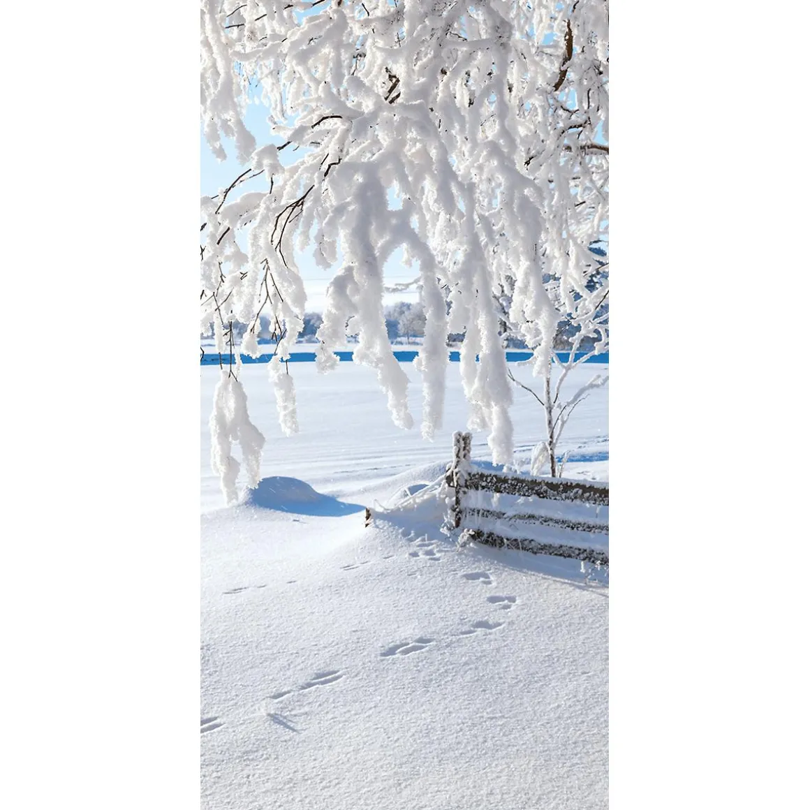 Der Winter hat sein weißes Kleid ausgebreitet: Auf diesem Stoffbanner ist die ganze Szenerie mit einer dicken, glänzenden Schneeschicht bedeckt. Im Vordergrund neigen sich einzelne Äste unter der Last der Schneemassen nach unten und Fußspuren haben ihre persönliche Note im Motiv hinterlassen. Im Hintergrund glitzert die weiße Schneelandschaft herrlich in der Sonne, während Wasser unter der dicken Eisschicht in blauen Farbtönen heraussticht. Stimmig, frostig, schön!