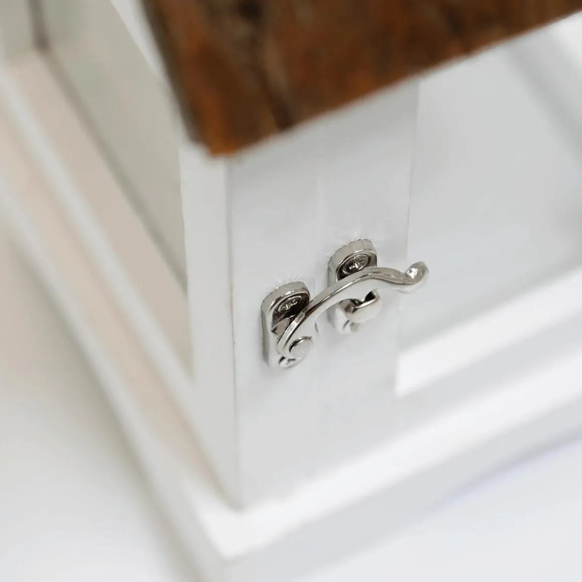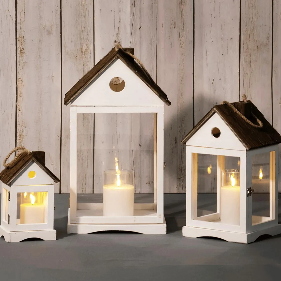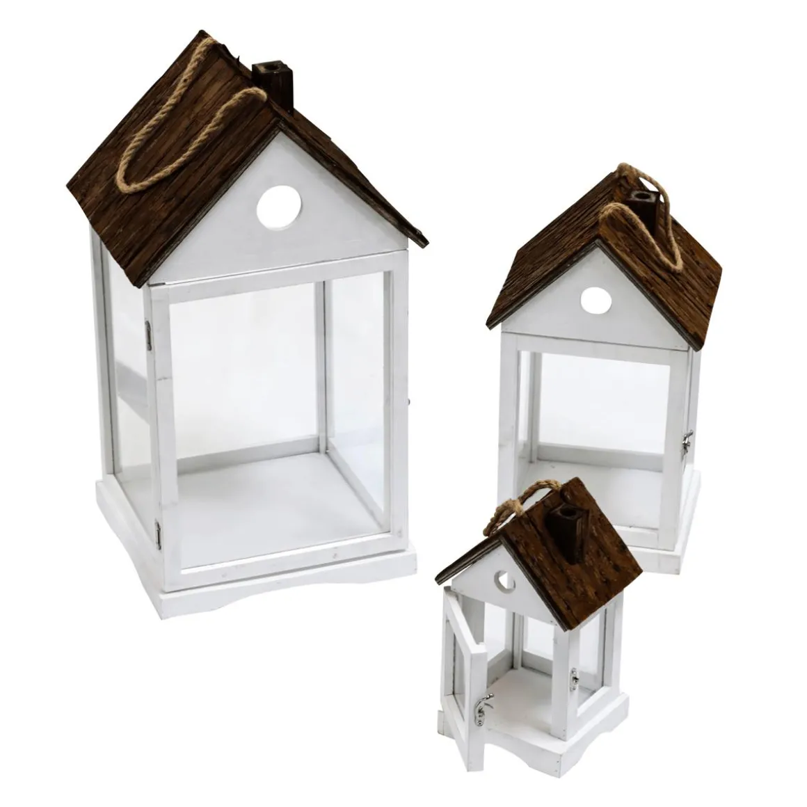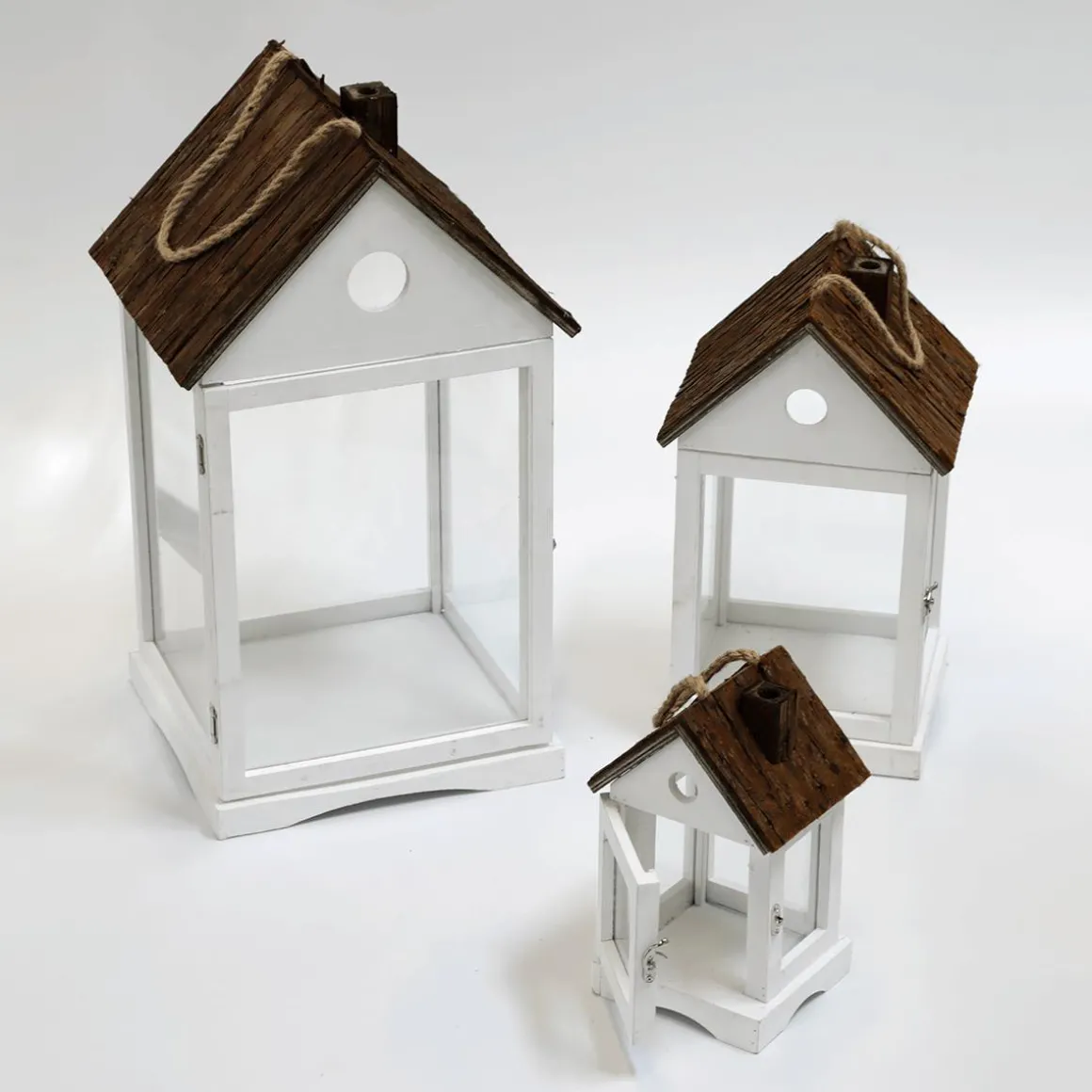 Drei unterschiedlich große Windlicht-Laternen für stilvolle Akzente im Innen- und Außenbereich. Das dekorative Laternen-Trio besteht aus weiß lackiertem Holz und Glas. Rustikales Dach aus Rinde mit Seilkordel-Griff zum Aufhängen und Tragen. Eine Seitenfenster ermöglicht ein einfaches Entnehmen von LED Kerzen.