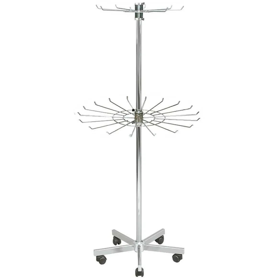 Gürtel- und Krawattenständer mit 2 drehbaren und individuell höhenverstellbaren Hakenkränzen, oberer Kranz 8-armig und 52 cm Ø, unterer Kranz 18-armig und 70 cm Ø, langlebige Konstruktion aus verchromtem Metall, stabiler 5-Stern-Fuß, 50 mm Ø ungebremste Kunststoffrollen für schnellen Platzwechsel, Preis per Stück