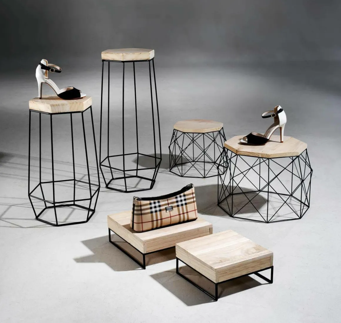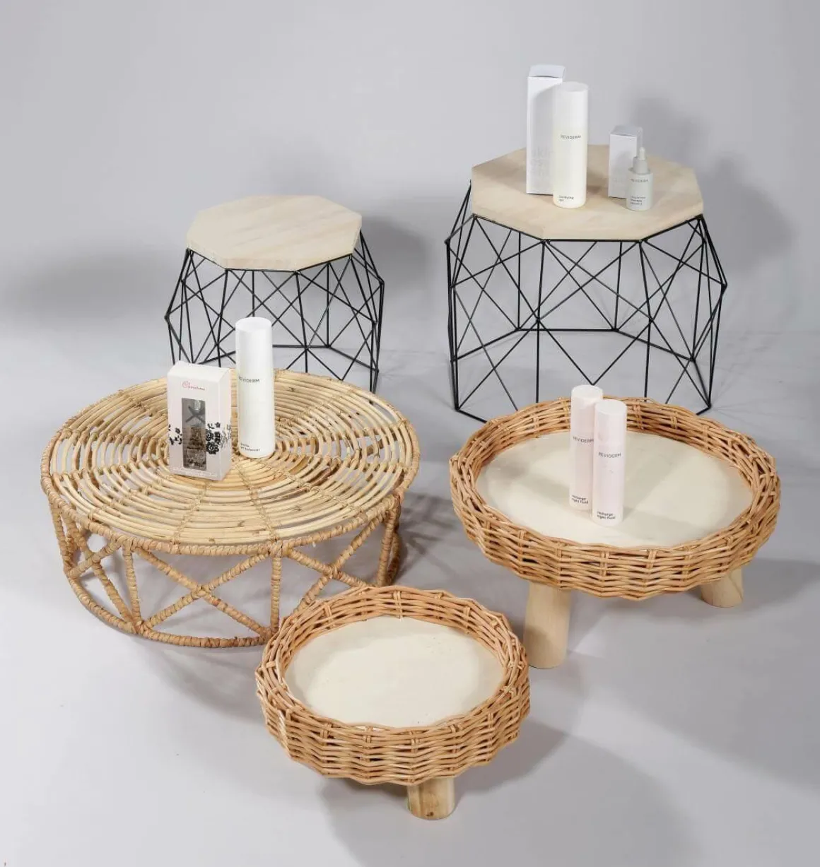 Unser Beistelltisch-Set kombiniert Design und Komfort, ist sehr originell, vielseitig und praktisch zugleich – das Tischset im Skandi-Style bietet tolle Einsatzmöglichkeiten. 2 cm starke Naturholz-Platte auf pulverbeschichtetem Metallgestell (3 mm Rundrohr), dessen Form an einen Korb erinnert. Preis per 2tlg. Set.