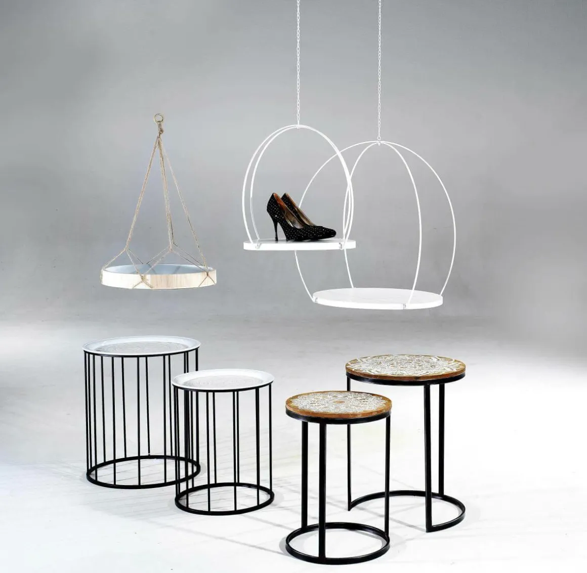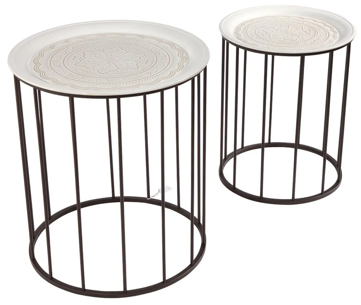 Beistelltische mit abnehmbarem Metall-Tablett mit Musterprägung im Vintage-Look. Rundes pulverbeschichtetes Metall-Gestell. Passend zum aktuellen Sommer Dekotrend Bohemian oder Ibiza. Preis per 2tlg. Set 47×55 + 38x47cm.