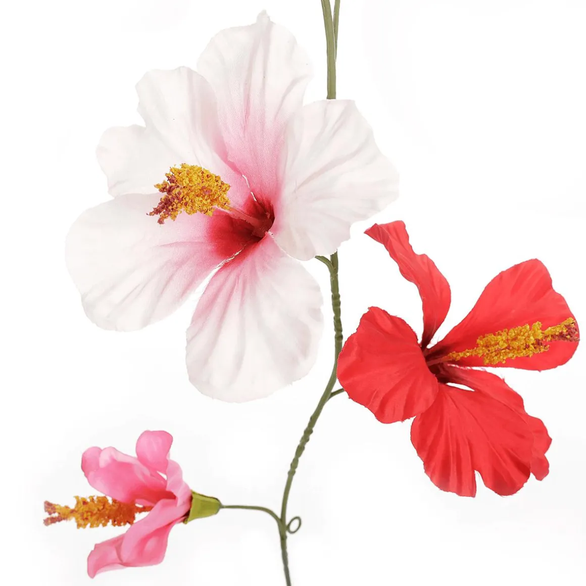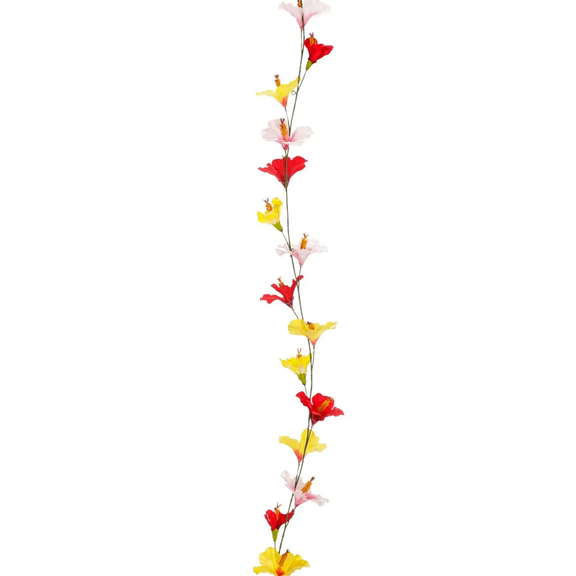 Wunderschön verarbeitete Hibiskusblütengirlande mit gelben, rosa und roten Blüten aus Textil, sehr realistisch verarbeitet.