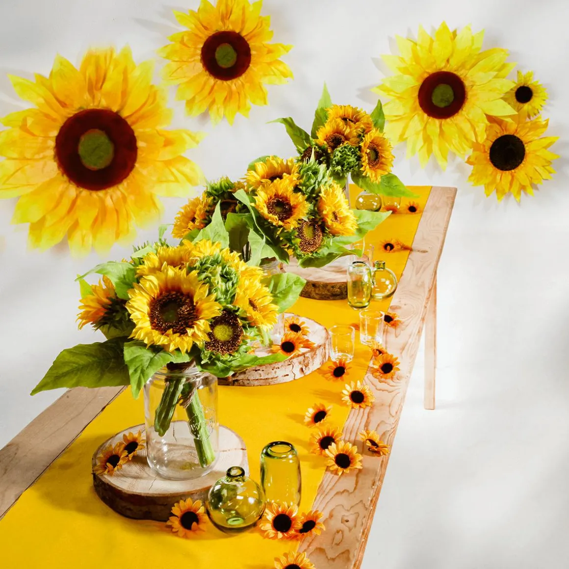 Diese Deko-Sonnenblume sorgt für fröhliche Stimmung und ist ein toller Farbtupfer in Ihrer Deko – kommt sie doch dank ihrer Größe und der leuchtenden gelben Farbe perfekt zur Geltung. Die künstlichen Blumenköpfe können liegend auf dem Boden oder als Wanddekoration dekoriert werden und je nachdem, welche Saison gerade ist, lassen sich Sonnenblumen auch mit fast allen Blumen kombinieren.