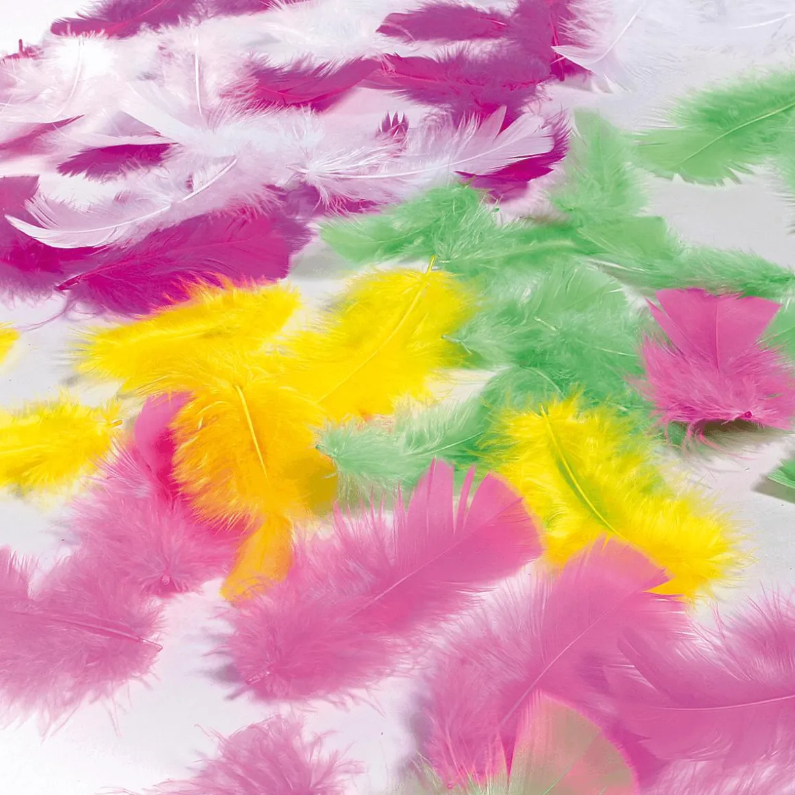Gefärbte Naturfedern für Hochzeitsdeko, Tischdeko, Basteln, Verpacken, Floristik sowie Kostüme für Karneval und Fasching. Traumfänger, Masken und Schmuckteile lassen sich leicht verzieren. 6 – 8 cm lang, ca. 150 Stück. Preis per Pack.
