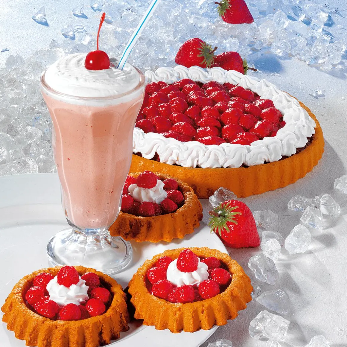 Hochwertig und mit sehr viel Liebe zum Detail verarbeitete Kunststoff Erdbeer-Tarte mit hellem Biskuitboden, sowie mit Fake Erdbeeren und Sahne dekoriert.