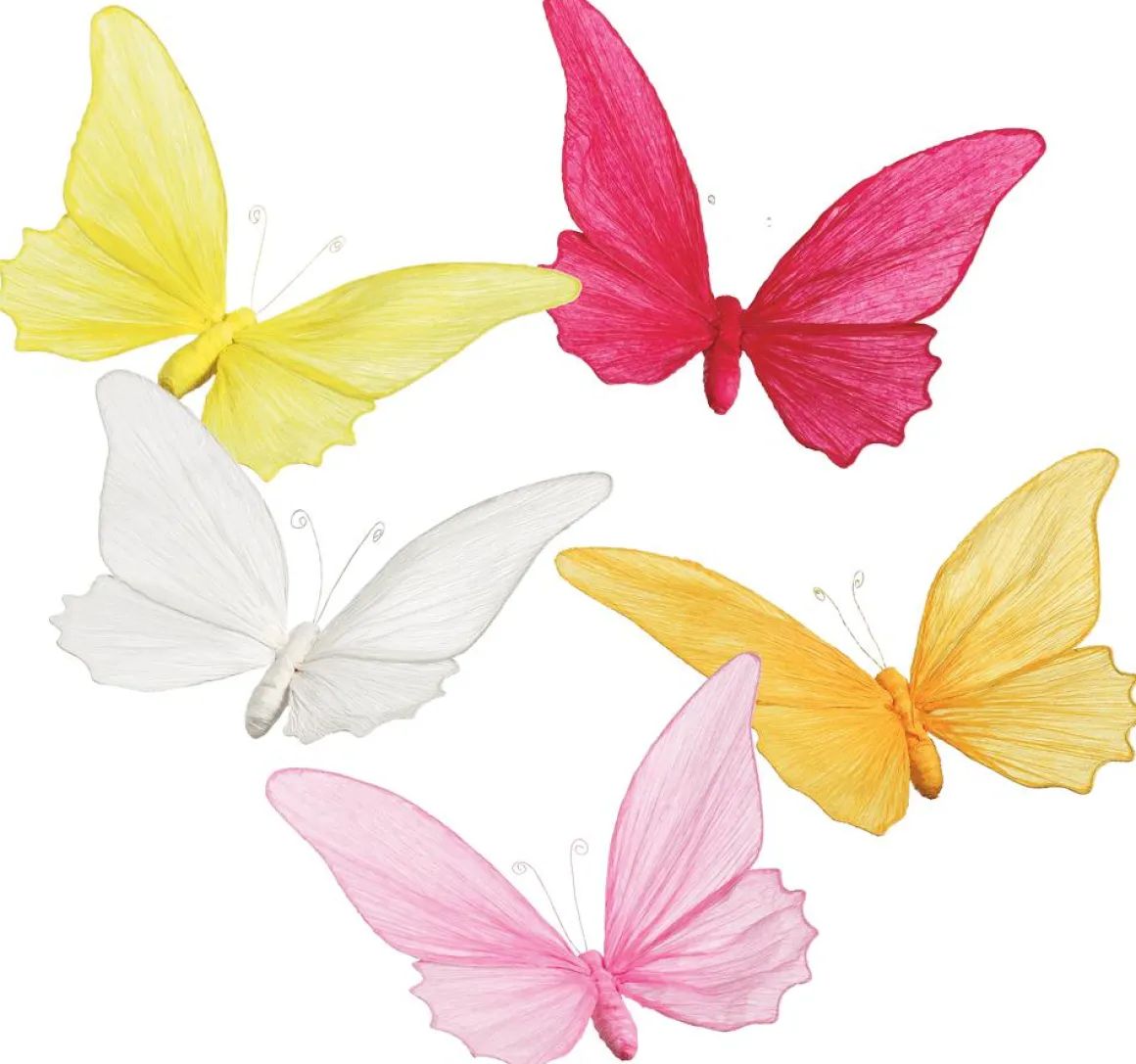 Filigran und elfenhaft – Schmetterlinge sind perfekt für Frühlings- oder Sommerdeko und ein ideales Accessoire für eine bezaubernde Hochzeitsdekoration. Zum kreativen Gestalten und Dekorieren oder als Hänge-Dekoration sind unsere leichten Schmetterlinge aus Krepp-Papier immer ein toller Eyecatcher. Drahtverstärkte, biegbare Flügel und Körper aus Hartschaum, inkl. Aufhänger. Preis per Pack à 5 Stück.