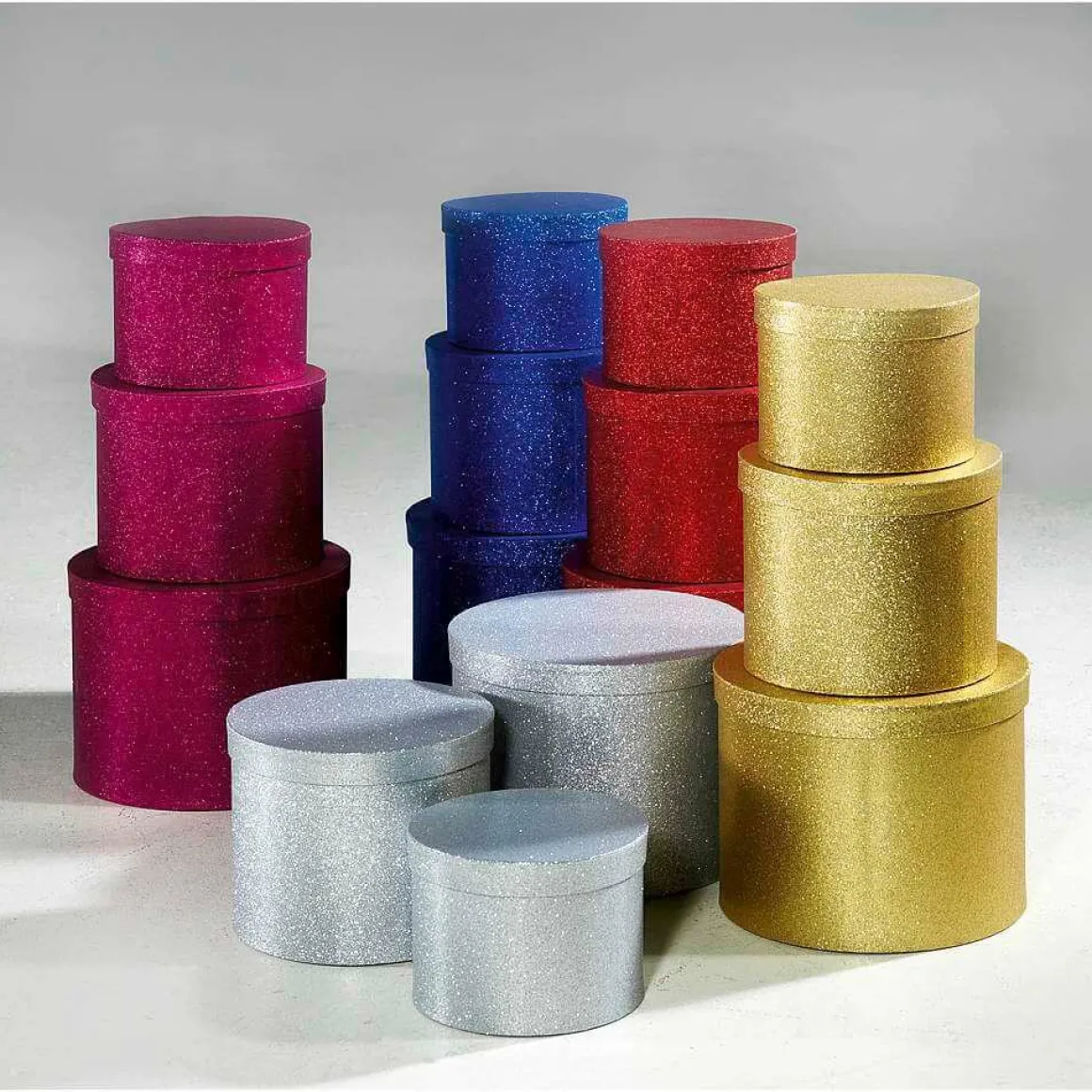 Dieses Geschenkboxen-Set in edler Aufmachung ist eine geschmackvolle sowie dekorative Lösung für Geschenke die sich nur schwer einpacken lassen, zerbrechlich sind oder aufgrund ihrer Exklusivität eine besondere Geschenkverpackung benötigen. Perfekt sind die als Geschenkverpackung zu Weihnachten, Jubiläum oder Geburtstag oder zu Aufbewahrung und Dekoration. Aus formstabilem Karton mit Deckel Allover-Glimmer, stapelbar und platzsparend ineinander schachtelbar. Preis per 3tlg. Satz.