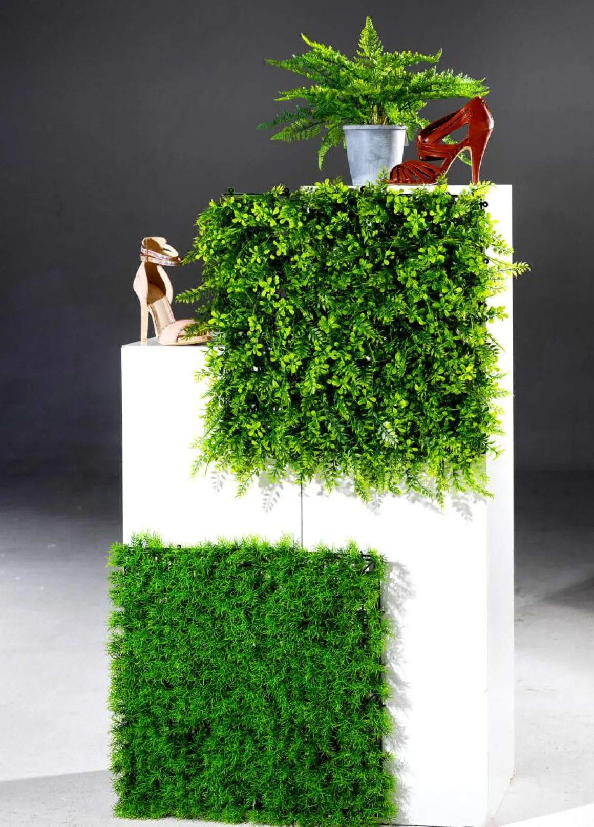 Kunstpflanzen überzeugen durch ihre Langlebigkeit, den geringen Pflegeaufwand und sind bestens geeignet für Standorte, die keine natürliche Bepflanzung zulassen. Aus hochwertigen Materialien hergestellt und von ihren natürlichen Vorbildern optisch nur schwer zu unterscheiden behalten sie für viele Jahre Form und Farbe. Das inspirierendes Grün der Kunstpflanzen schafft hochwertige ausgefallene Kunstbepflanzung oder Vertikalbegrünung mit Ambiente mit angenehmer, einladender Atmosphäre. Gitternetz aus Kunststoff, durch Ösen am Gitternetz können die Paneele zusammengesetzt und fixiert werden. Unser Tipp: für langlebige Farbentreue empfehlen wir eine Behandlung mit UV Schutz Spray aus unserem Sortiment.