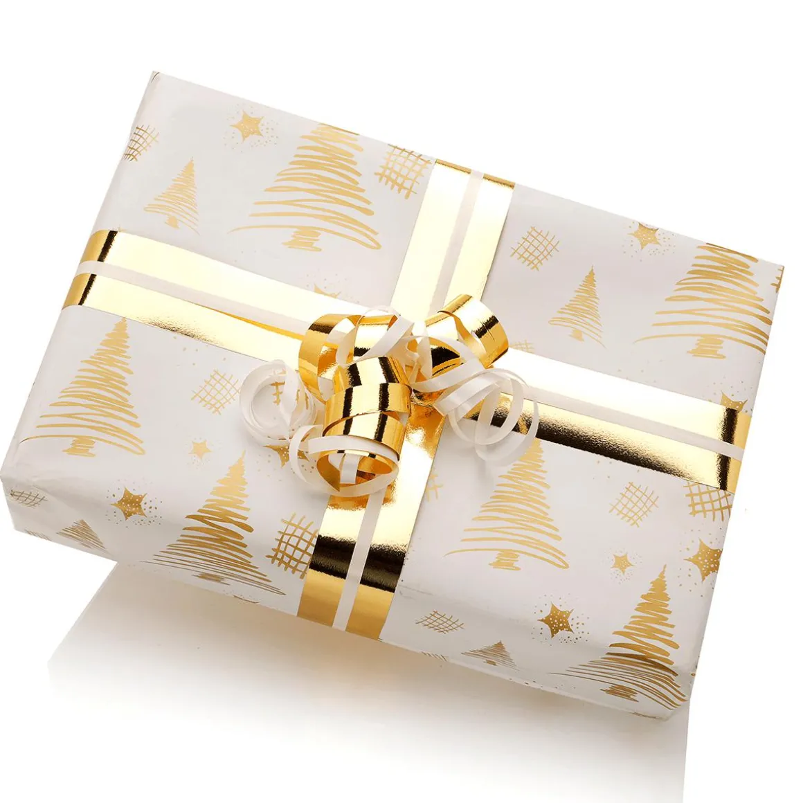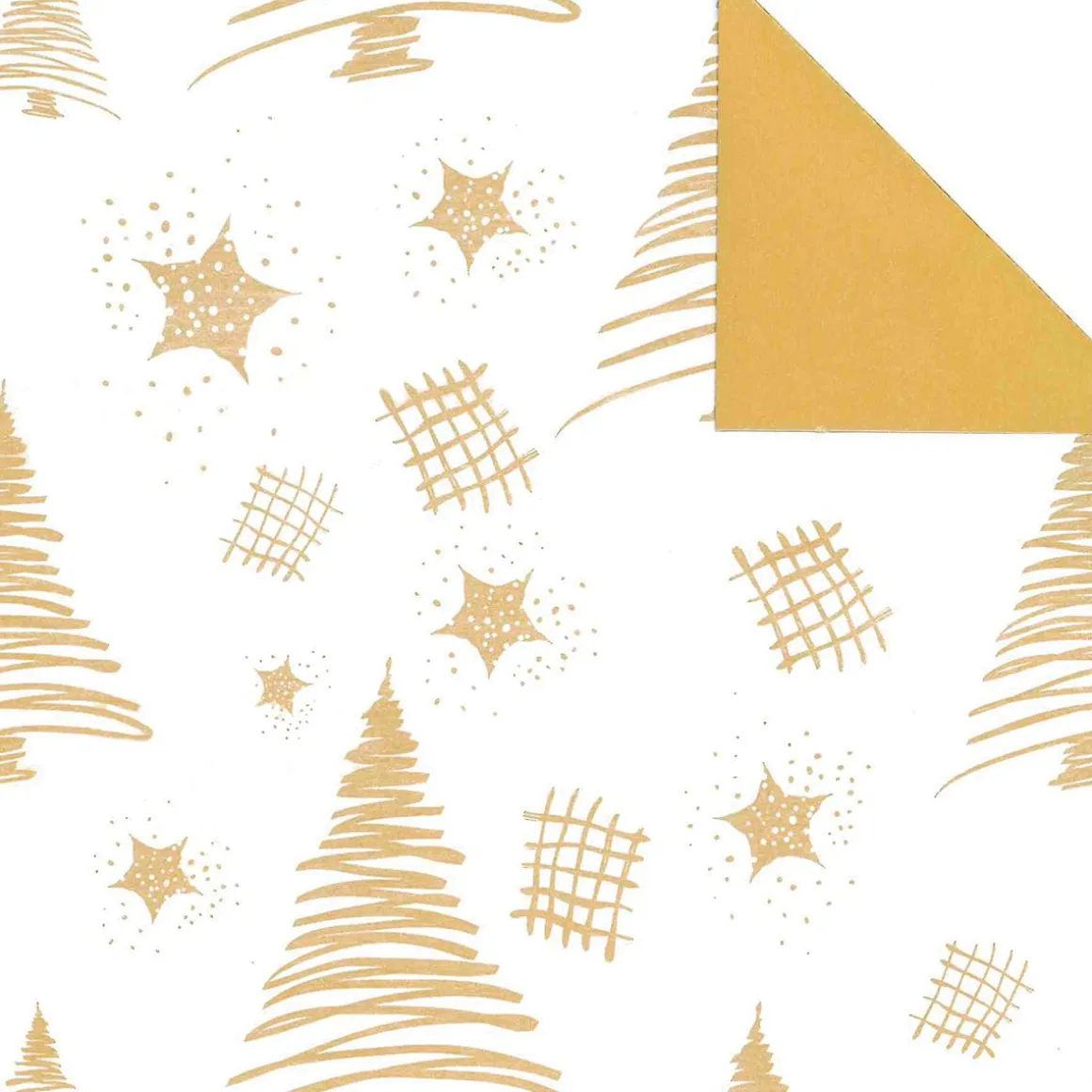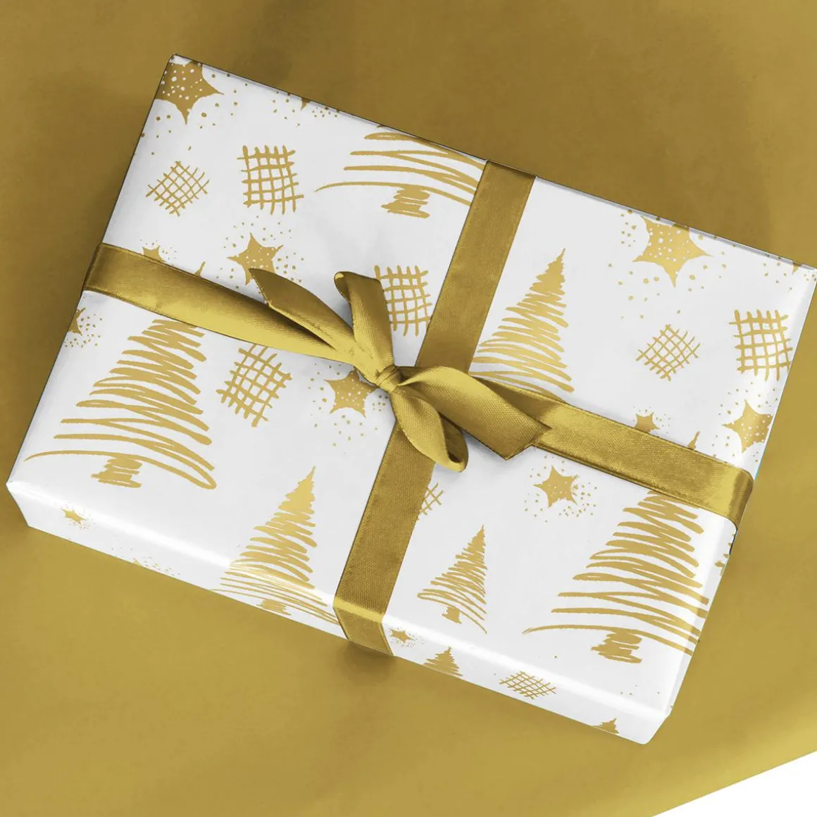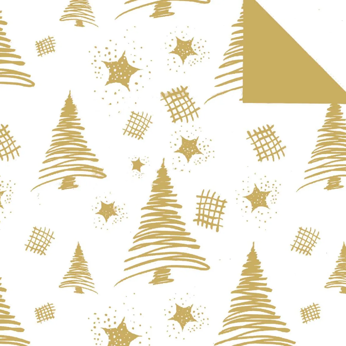 Himmlisch schön! Doppelseitig bedrucktes, ökologisches Geschenkpapier mit goldenen Tannenbäumen & Sternen