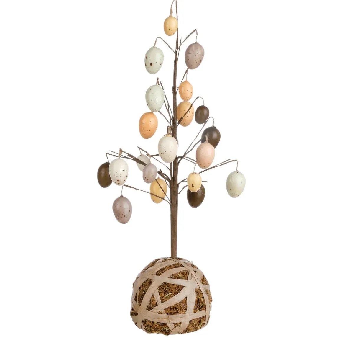 Dekorativer Baum mit Kunststoff-Ostereiern, selbststehend, Standfuss aus Hartschaum, mit Moos und Bast umwickelt, Preis per Stück