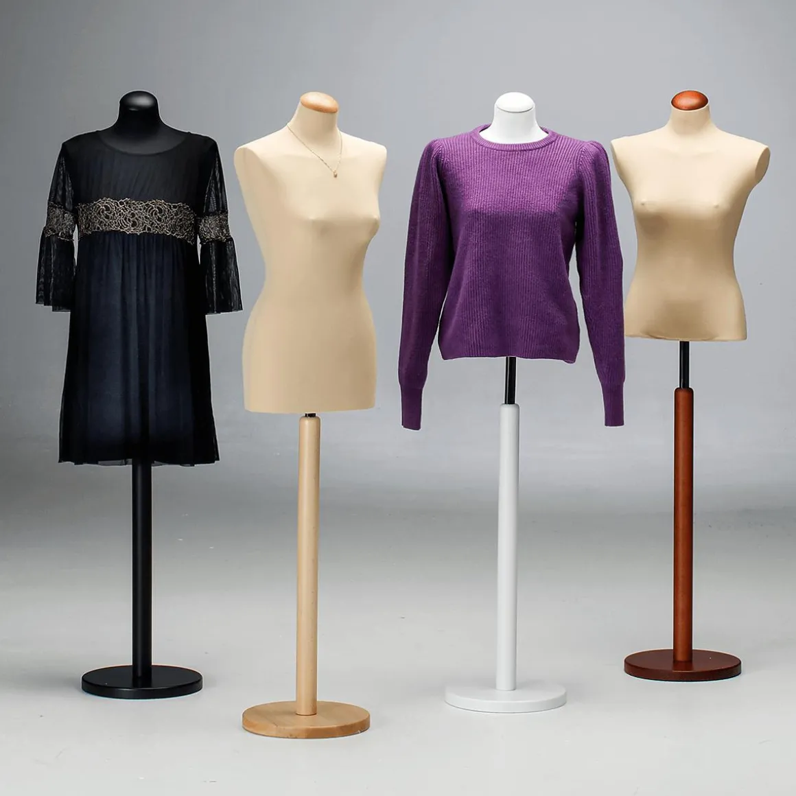 Auf den Leib geschneidert: der Einsatz dieser eleganten Damenbüste rückt Ihre Ware in den Mittelpunkt und sorgt für perfekt sitzende Kleidungsstücke. Ein höhenverstellbarer Standfuß mit robuster Mechanik ermöglicht die optimale Präsentation von extra kurzer sowie überlanger Bekleidung. Sicherer Stand für den professionellen Einsatz in Boutiquen, Bekleidungsgeschäften oder im Atelier dank stabiler Basis. Darüber hinaus dient die Schneiderbüste mit steckbarem Styropor-Korpus auch zum Erstellen von Schnittmustern, Drapieren des Stoffs sowie zum Präsentation von Entwürfen und Kollektionen. In Ladengeschäften mit engen Raumverhältnissen findet die Büste auch ohne Ständer den Einsatz als Tischbüste. Der geringere Anschaffungspreis im Vergleich zu einer Schaufensterfigur sowie die flexiblen und vielseitigen Einsatzmöglichkeiten sind weitere Vorteile dieser Schneiderbüste. Qualitativ hochwertig hergestellt in Europa punktet dieses funktionale Multitalent darüber hinaus mit einem sehr guten Preis-Leistungs-Verhältnis. Ausgestattet für eine Vielzahl von Anforderungen: Büste aus benutzerfreundlichem und sehr leichtem Polyrethan-Schaum, Polyester-Überzug mit perfektem Haftvermögen für jegliche Art Kleidung (waschbar und austauschbar), höhenverstellbar, farblich abgestimmte, runde Vollholz-Basis (30 cm Ø) und Halsabschluß, sehr standsicher. Ersatzbezüge sowie Ersatz-Torsos finden Sie in unserem Sortiment. Preis per Stück.