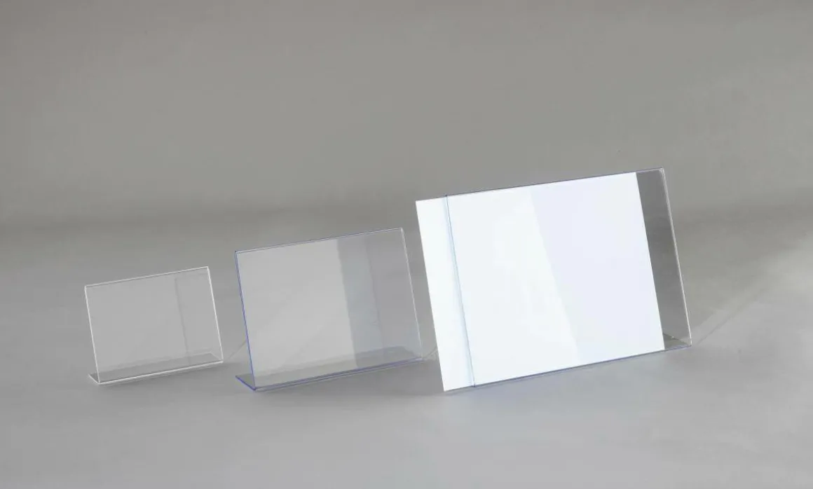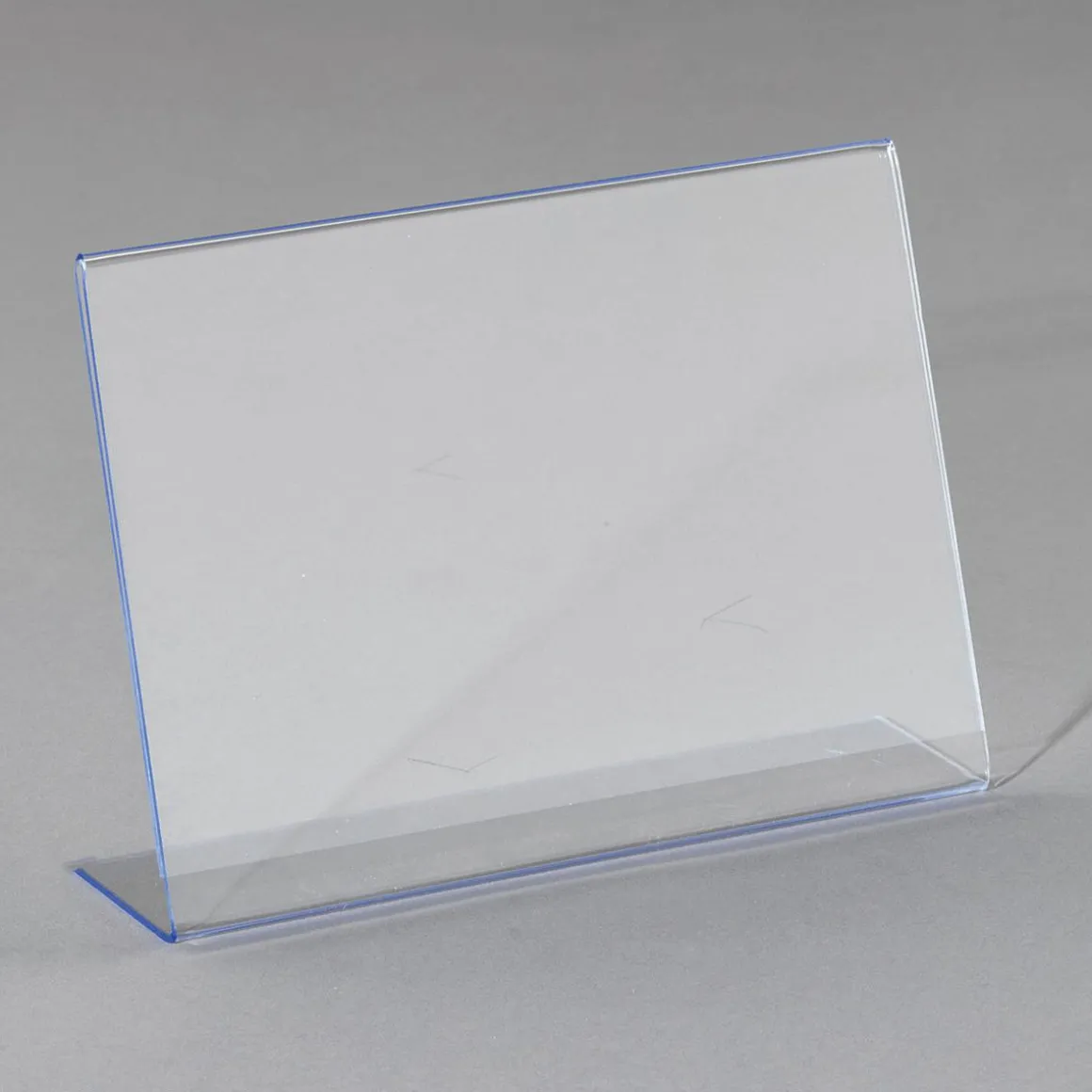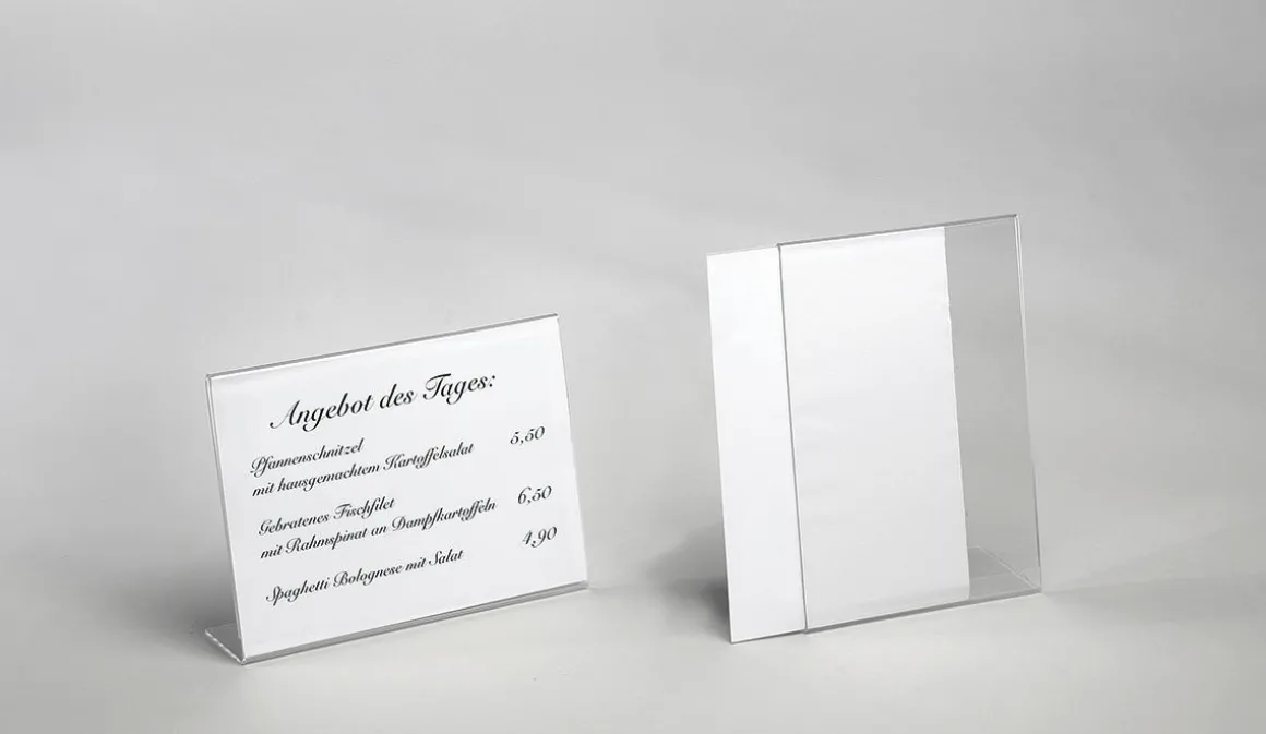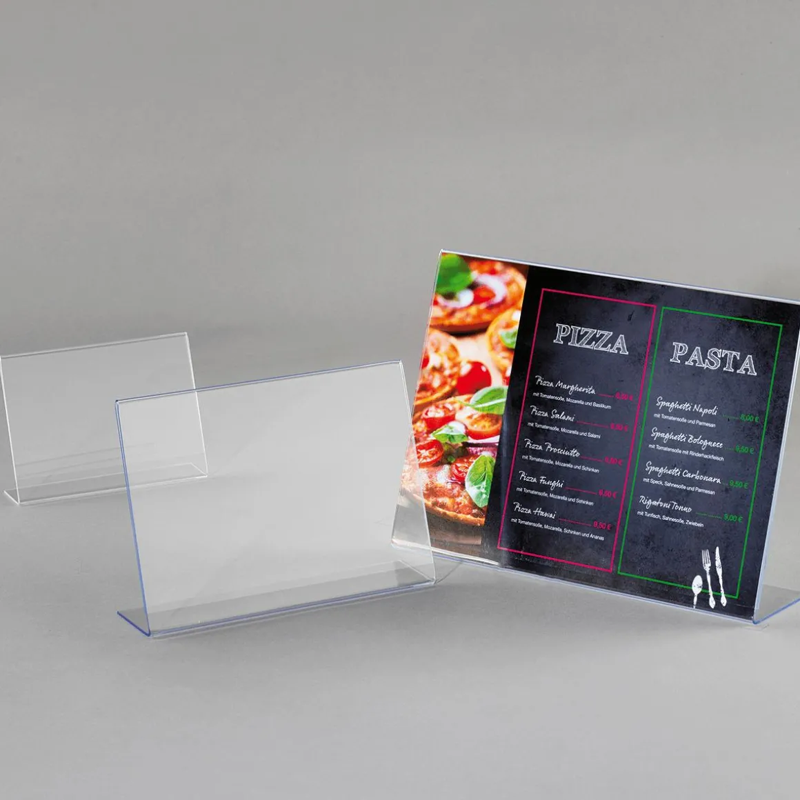L-Ständer aus hochwertigem Acrylglas mit seitlichem Einschub, UV-Beständig, kratzfest sowie hohe Stabilität durch 2 mm Acrylstärke; schräge Aufstellung für einseitige Präsentation – vielseitig und optimal für Preisauszeichnung, als Menükarten-Aufsteller oder Infohalter auf Messen, Seminaren oder Ausstellungen; um Kratzer zu vermeiden, ist eine bunte Schutzfolie angebracht, die sich leicht abziehen lässt; Preis per Stück